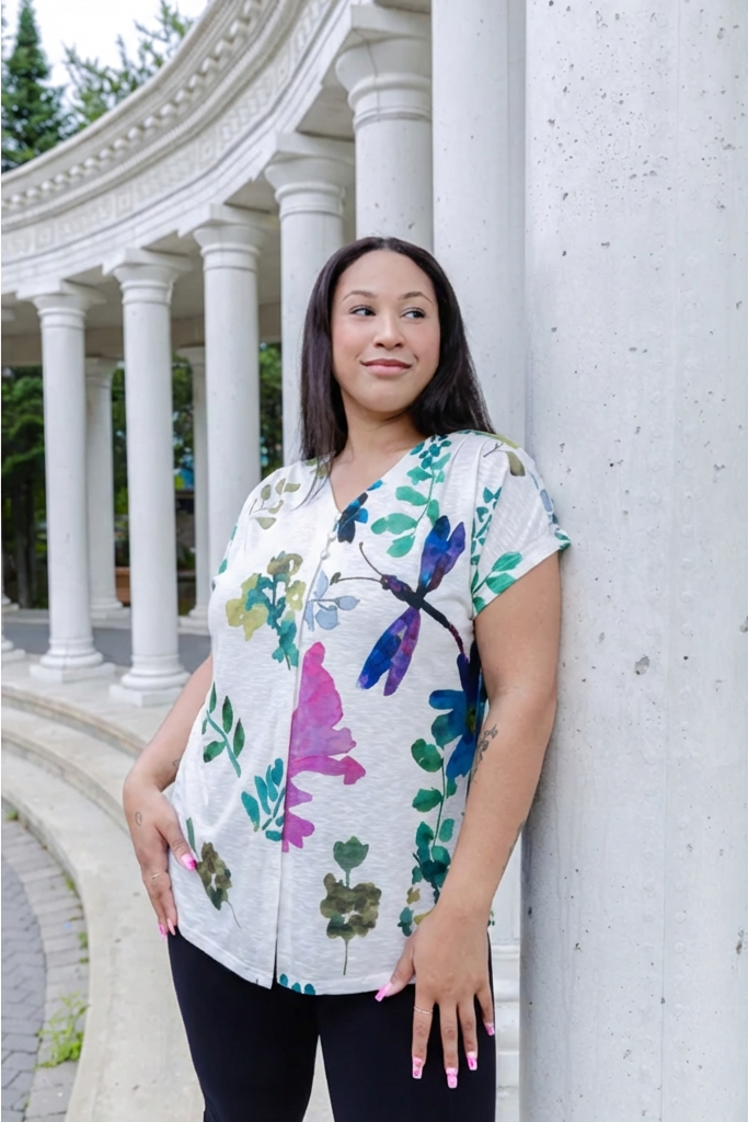 Introducing our draped short sleeve top with a playful v-neck and 3 decorative buttons. The a-line cut creates a beautiful, flattering fit for all body types.