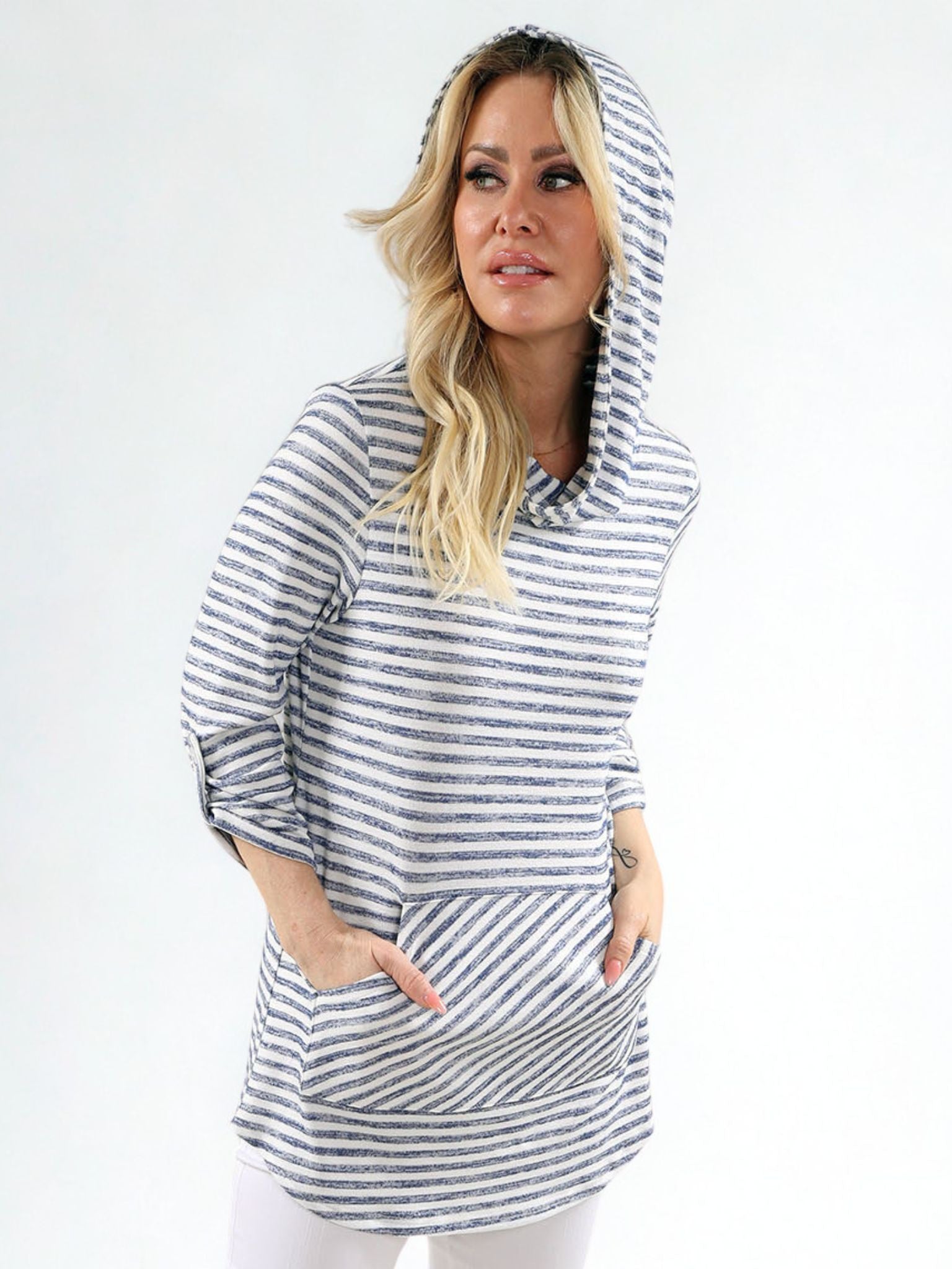 Elevate your casual wardrobe with this Michael Tyler denim striped cowl neck hooded tunic. Designed for comfort and style, it features a relaxed round hemline, functional kangaroo pocket, and three-quarter sleeves with distinctive strap and button detailing. The cozy cowl neckline and hood make it perfect for layering or wearing solo. A versatile piece that transitions effortlessly from weekend errands to relaxed gatherings.