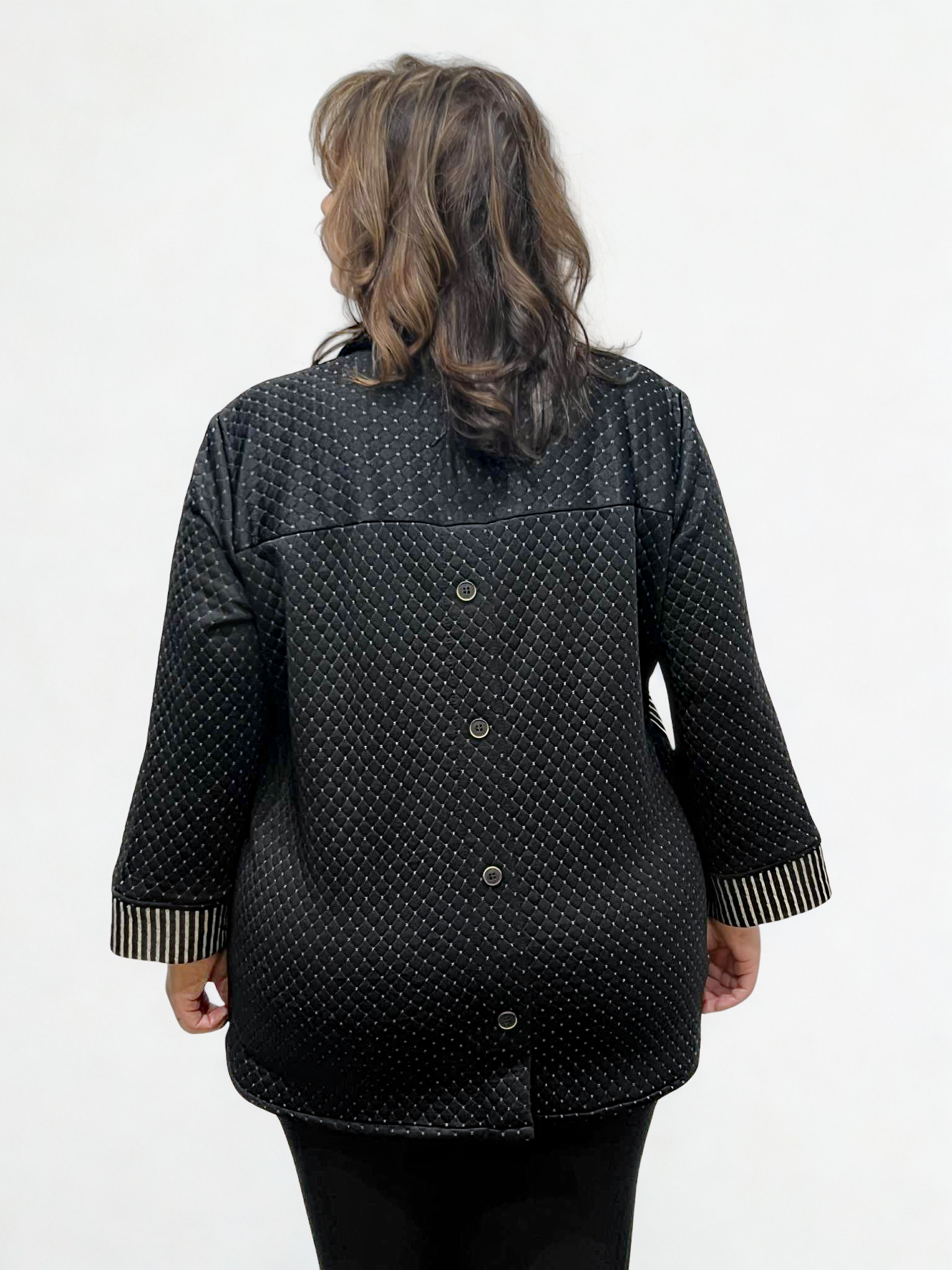 Step out in style with the Pure Essence Lightly Quilted Jacket, featuring a playful black and mocha color block design. Its button closure and collar add classic charm, while side pockets keep your hands cozy. The fun button details on the back and flattering A-line cut make this jacket your go-to for effortless cool and comfort.