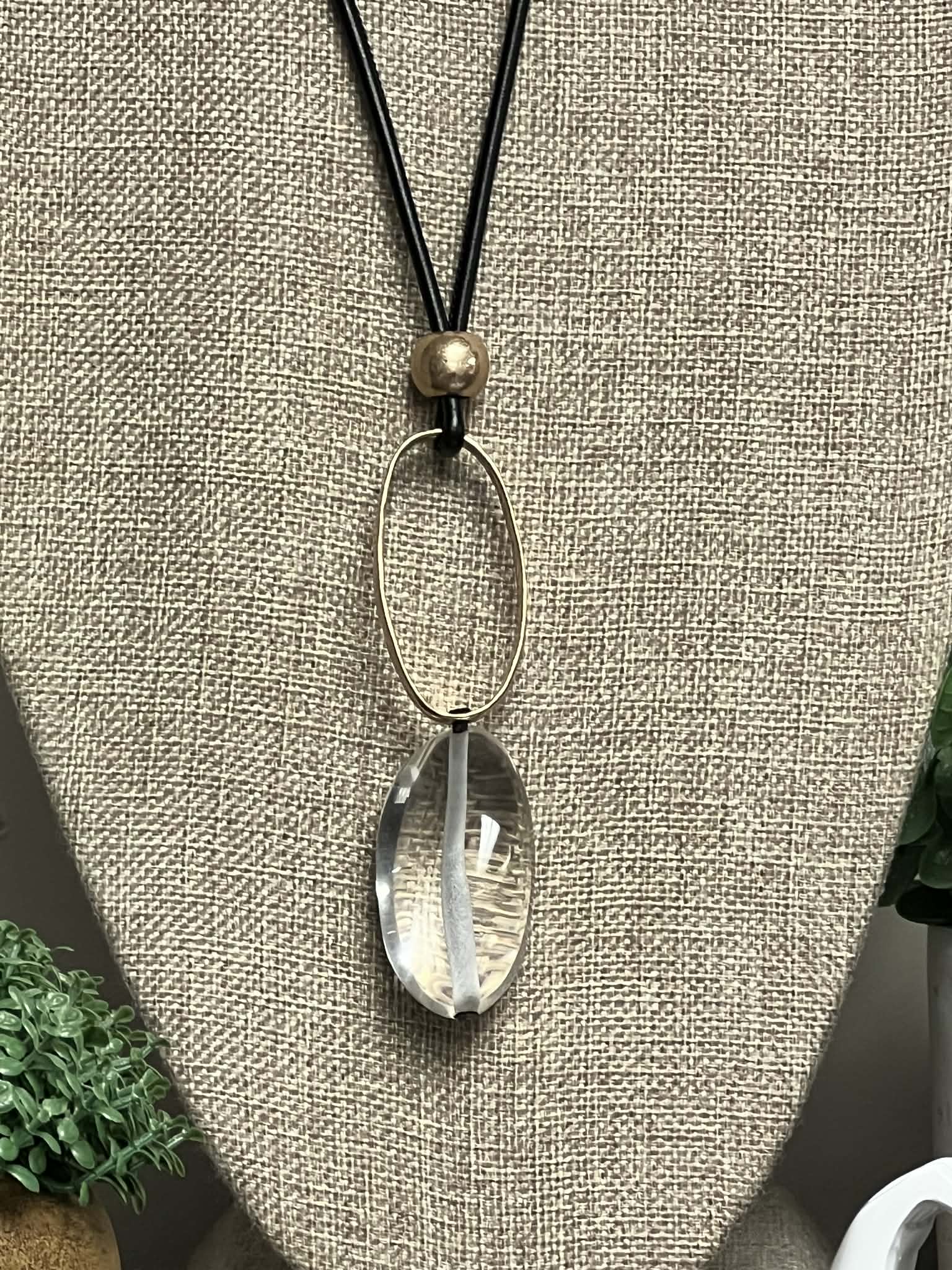 Black Adjustable Leather String Necklace with Frosted Gold Ring