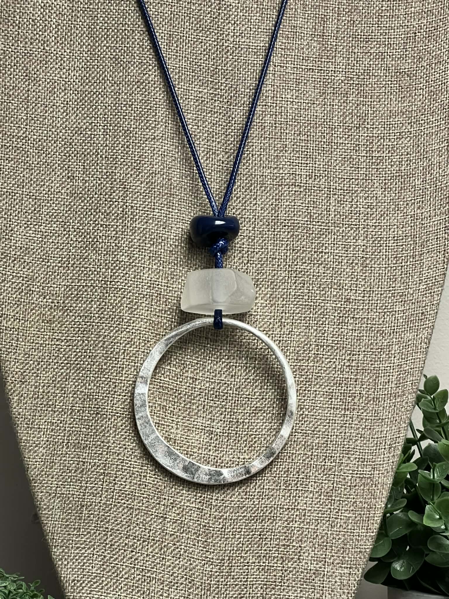 Blue Adjustable String Necklace with Silver Ring Pendant