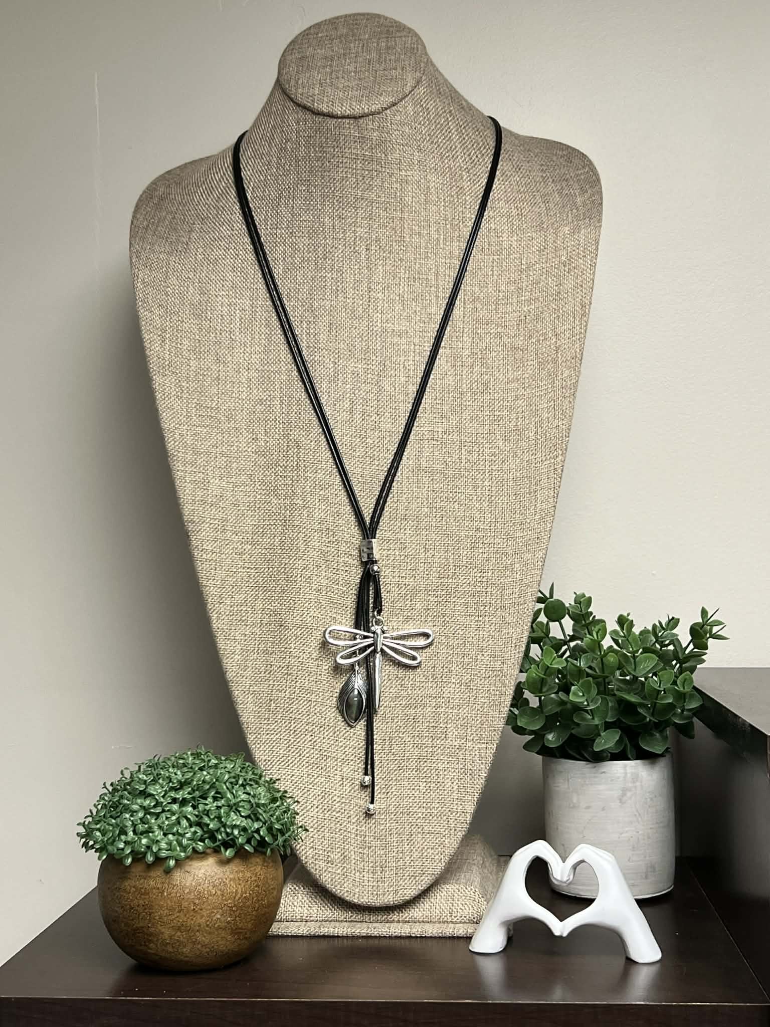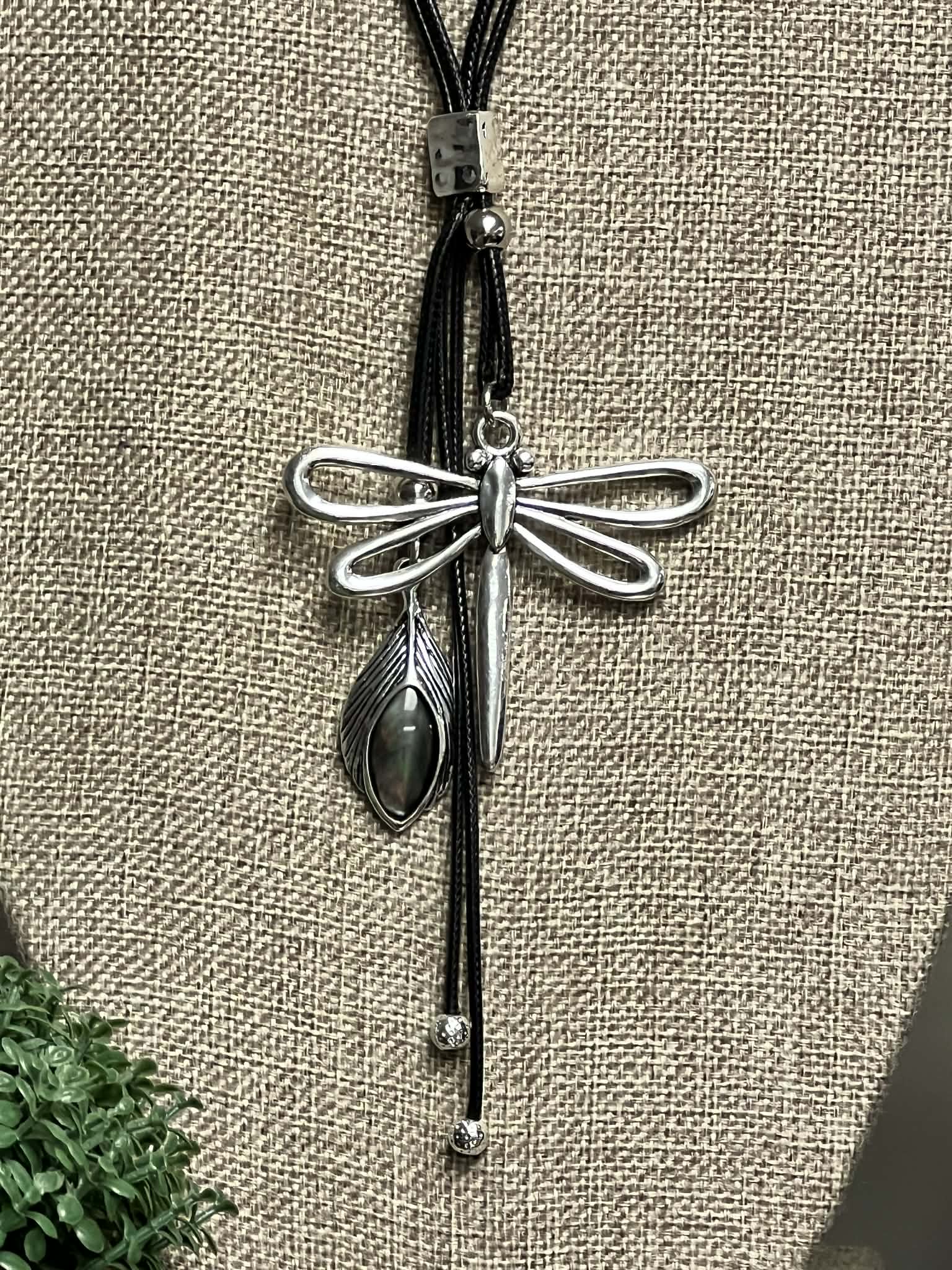 Black Adjustable Leather String Necklace with Dragonfly Pendant