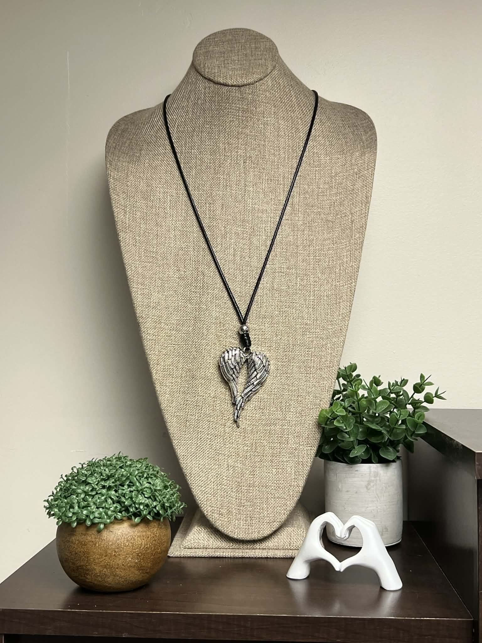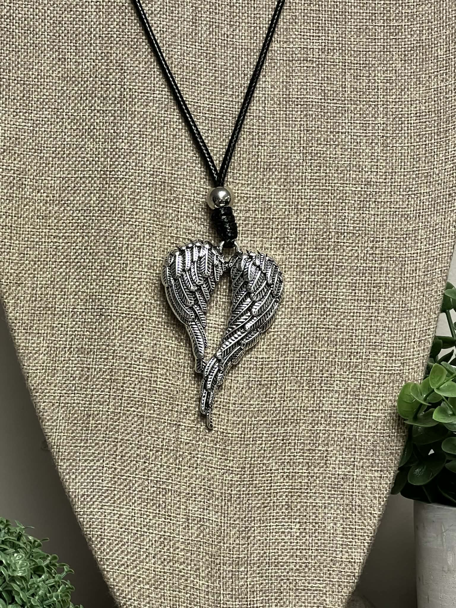Black Adjustable Leather String with Silver Angel WingsPendant