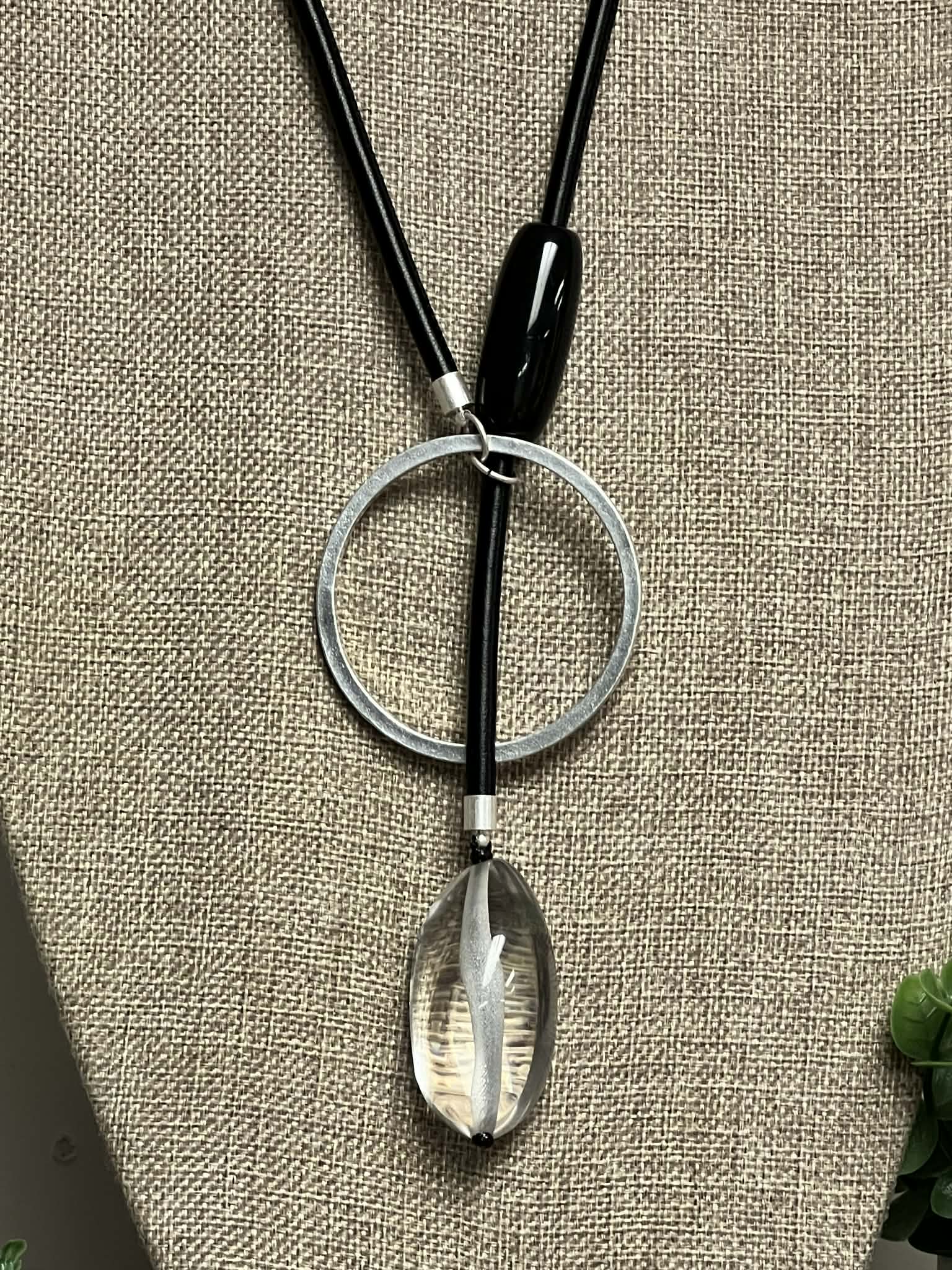 Thick Black String Whimsical Necklace with Silver Ring and Resin Beads