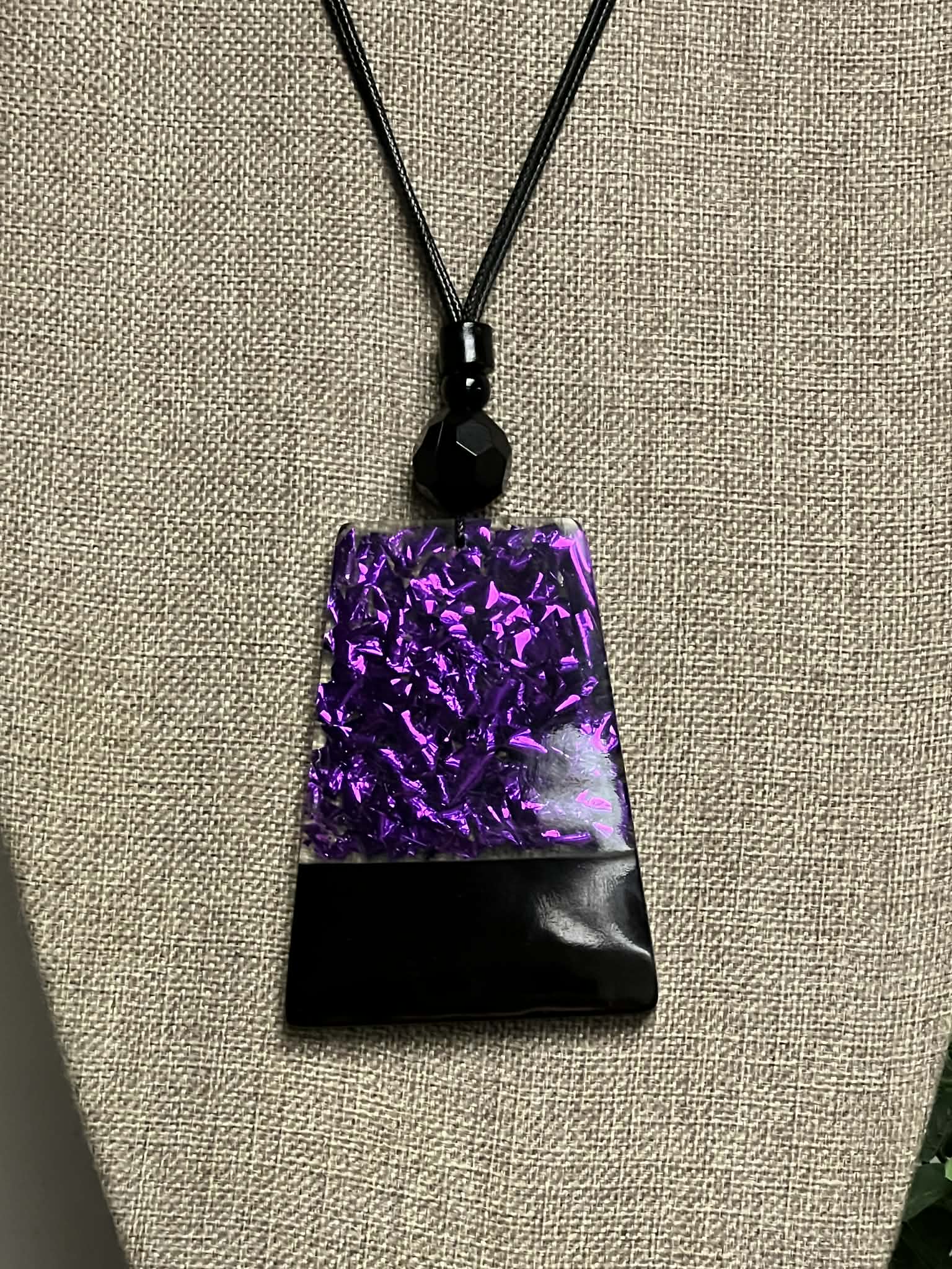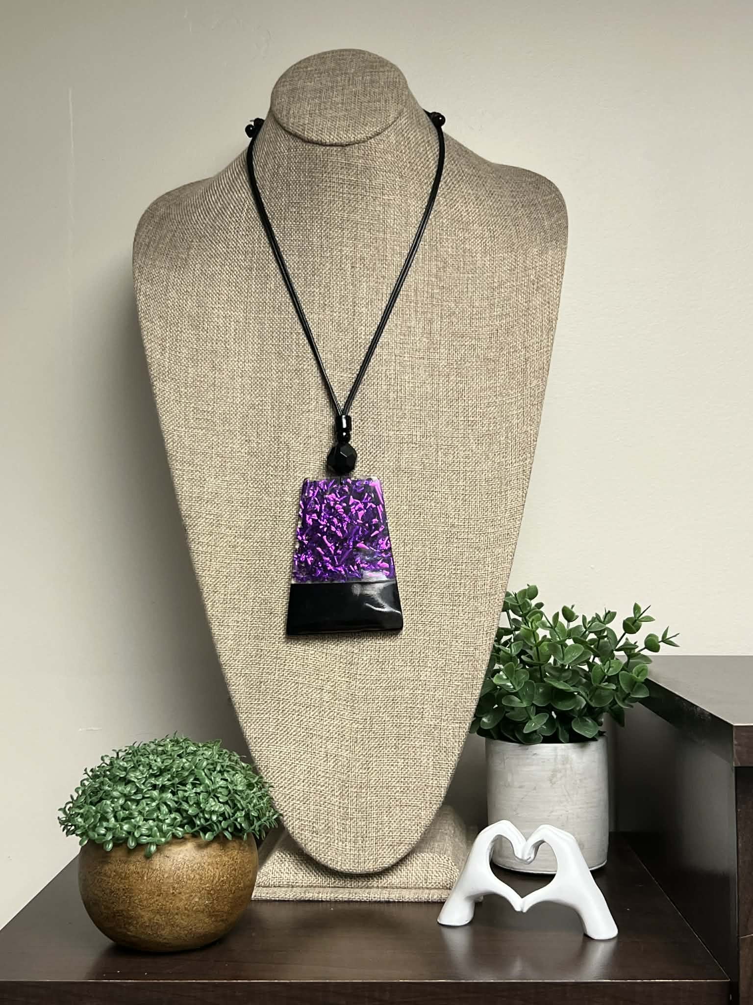 Adjustable String Necklace with Purple Foil Resin Pendant