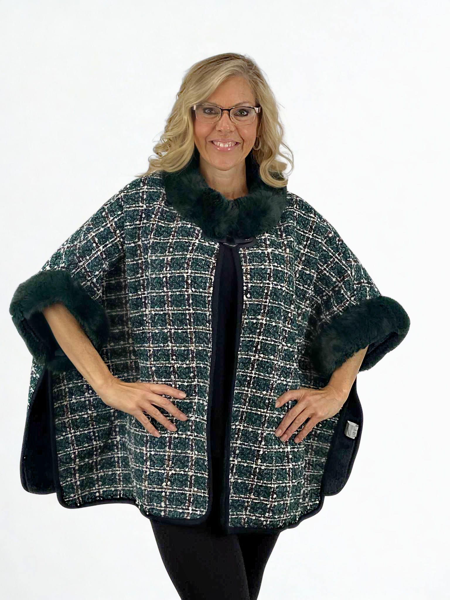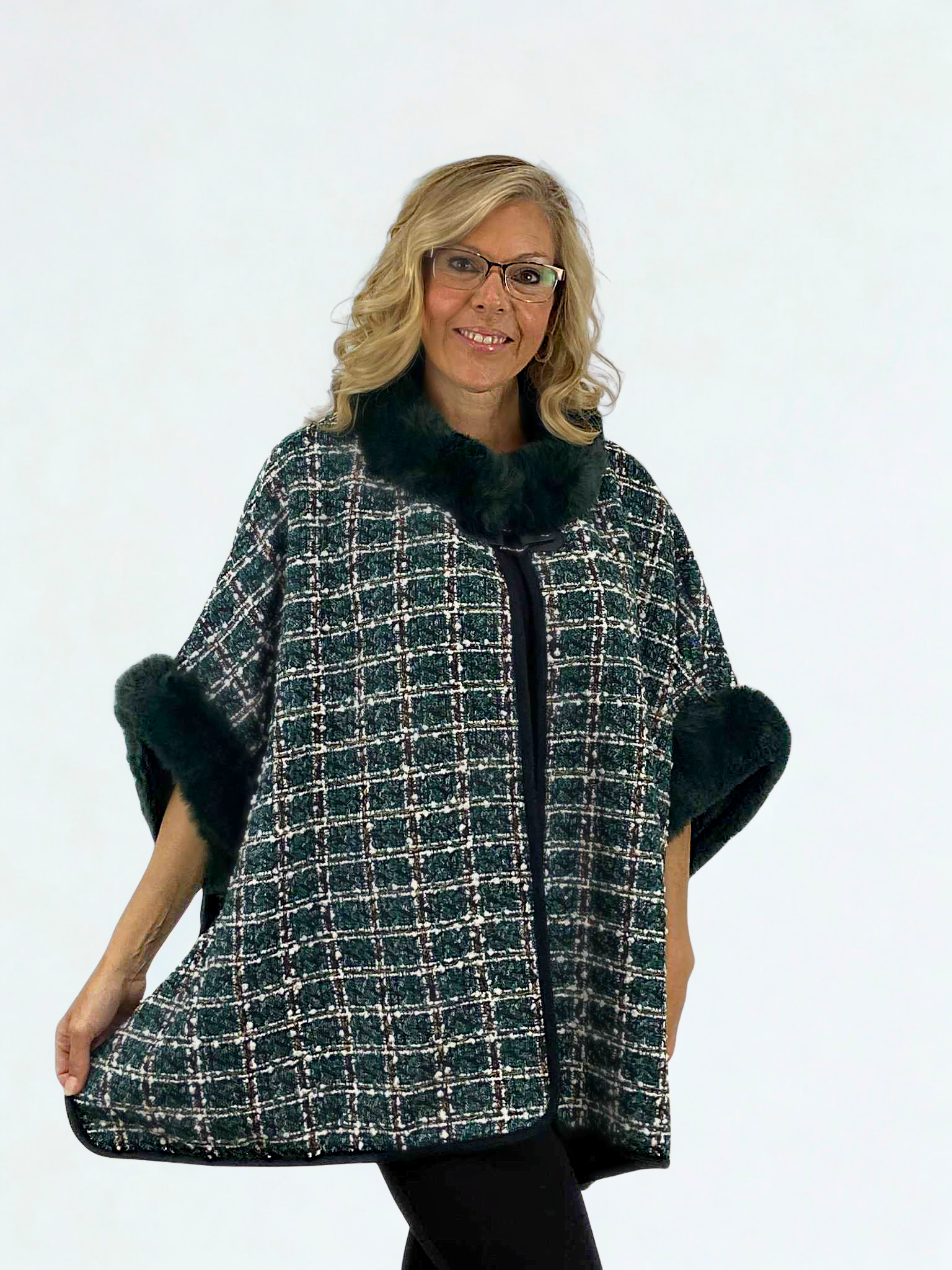 Cozy up in style with the One Size Evergreen Tweed Poncho! This lightweight, playful plaid piece features a soft furry lining and chic faux fur trim for extra comfort. Finished with a black faux leather strap closure, it’s the perfect way to add warmth and a pop of fun to your look.