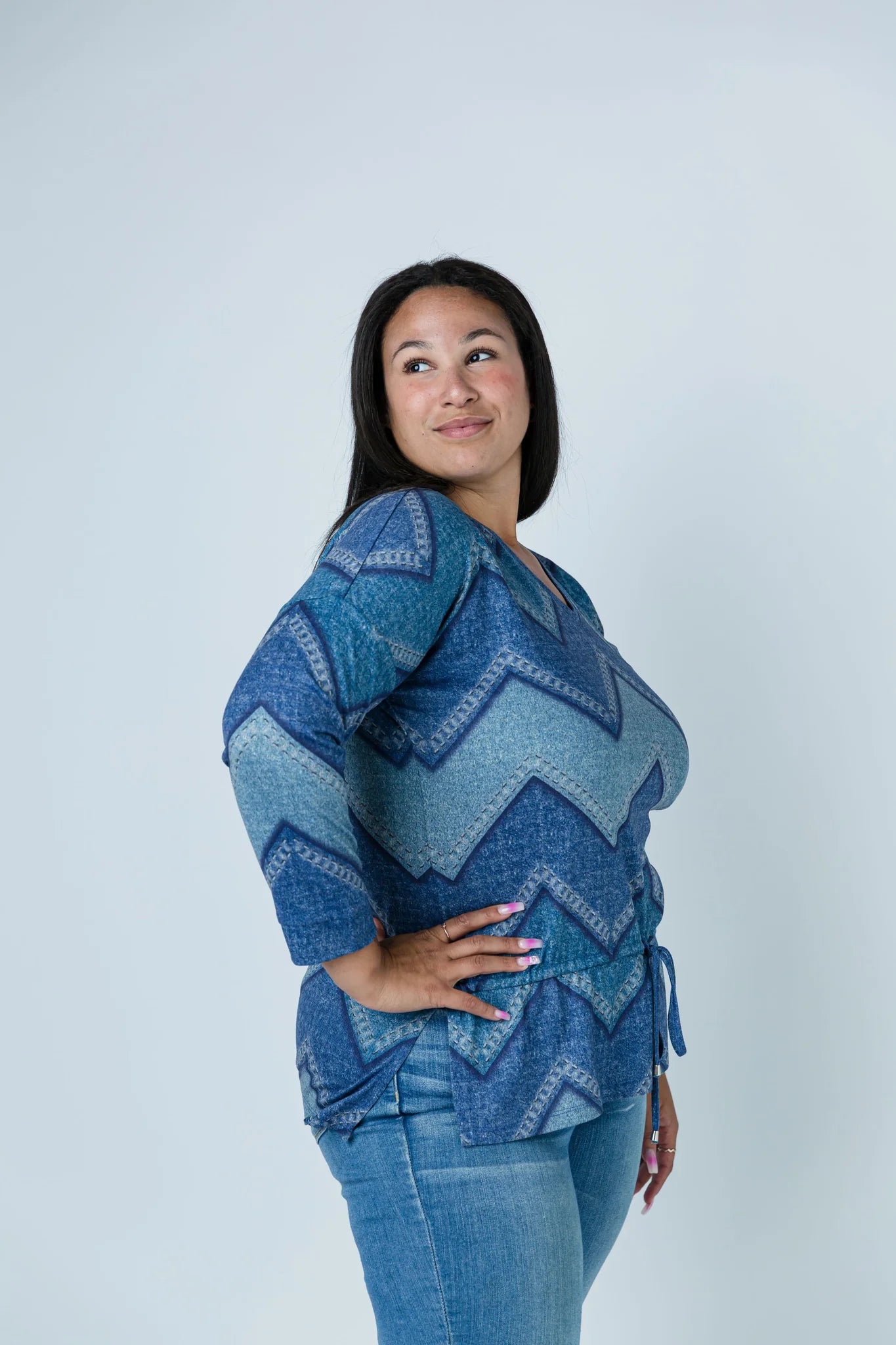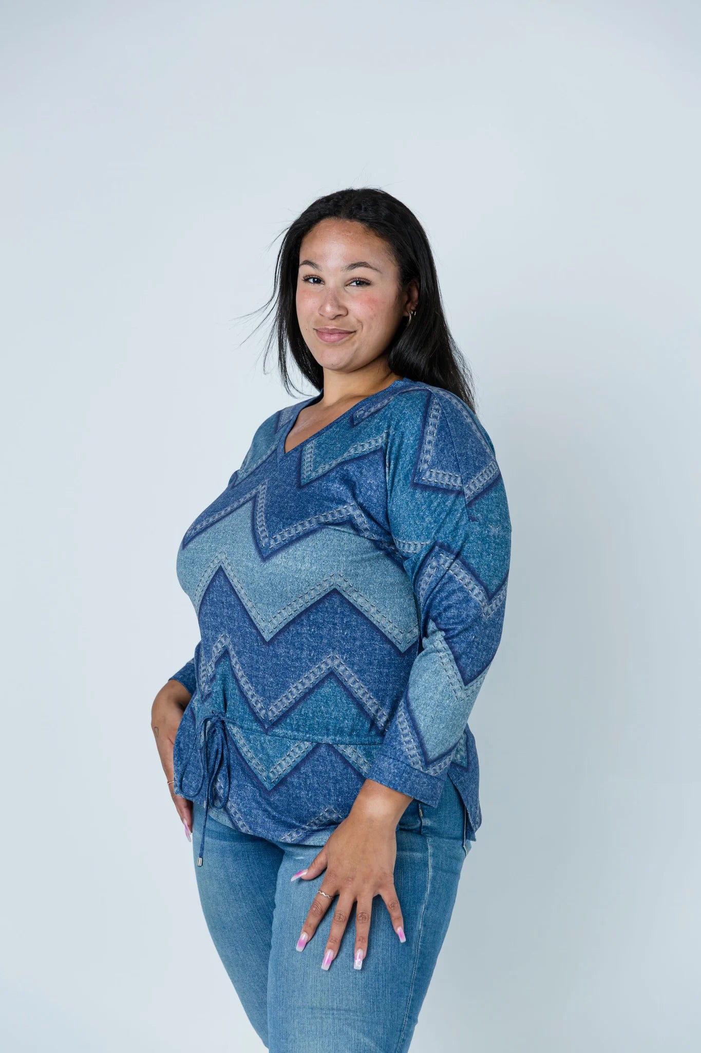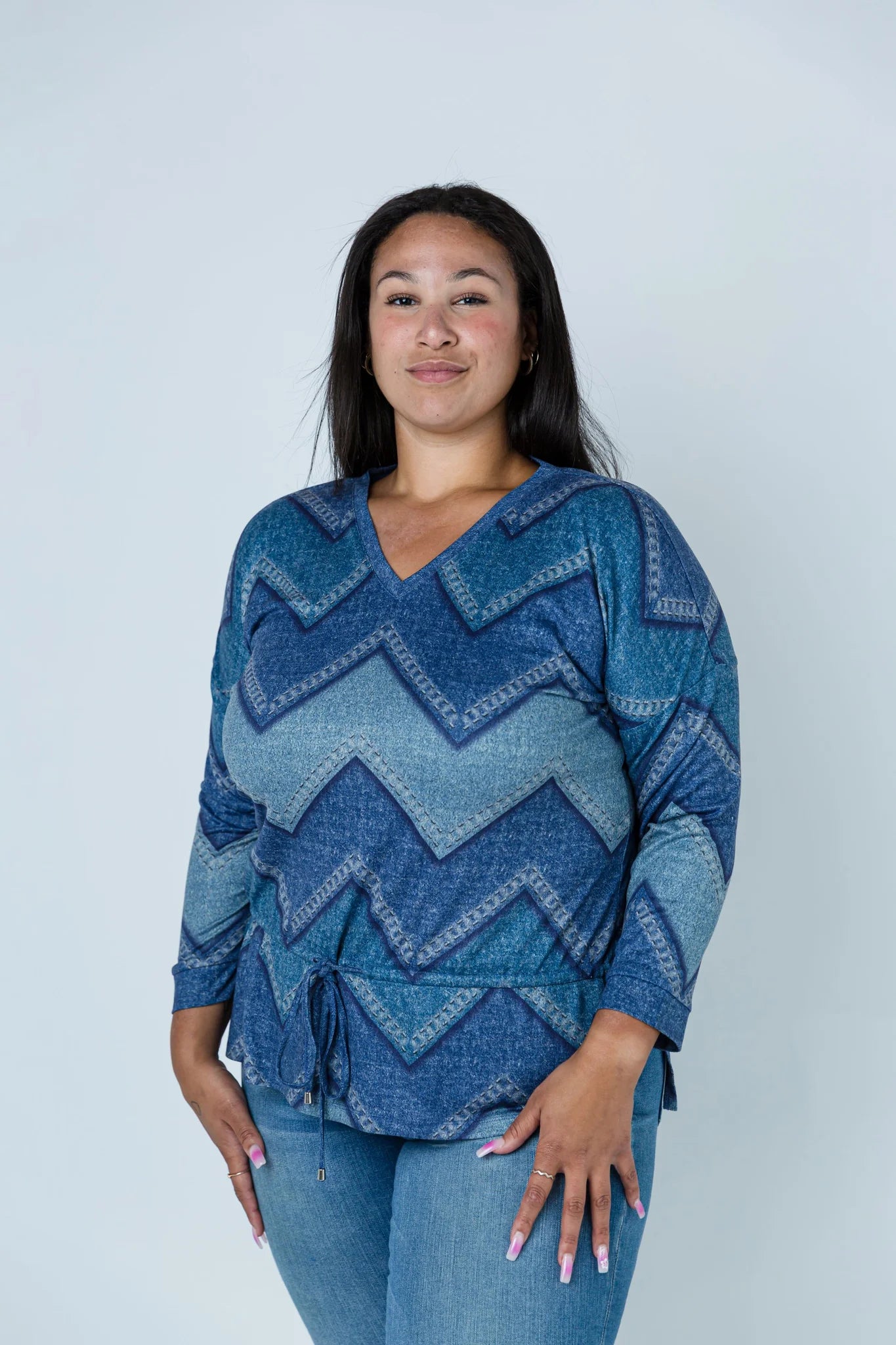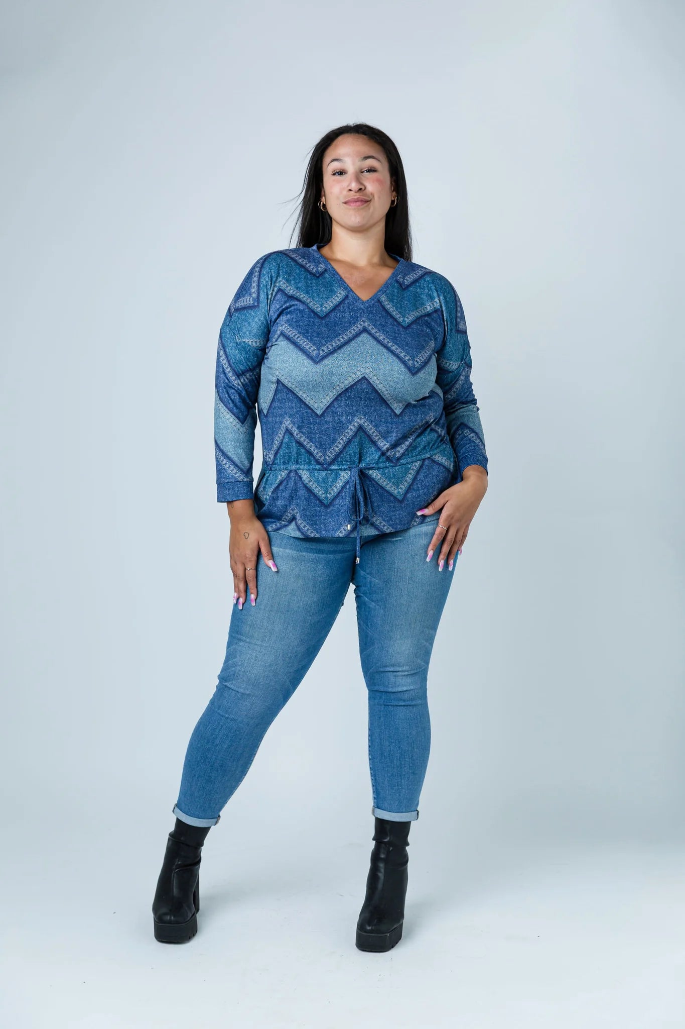 Add some spunk to your wardrobe with our Black LABB sweater! This lightweight sweater features a v-neck and a playful chevron print detail, along with a unique lower drawstring waist for a flirty peplum look. Perfect for a casual yet cute look.