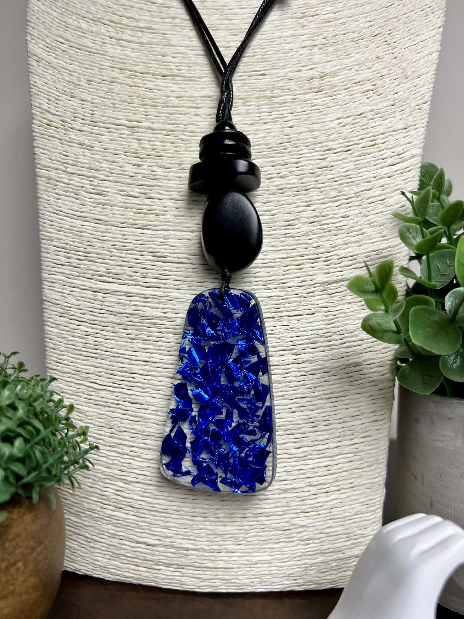Adjustable String Necklace with Blue Resin Foil Pendant