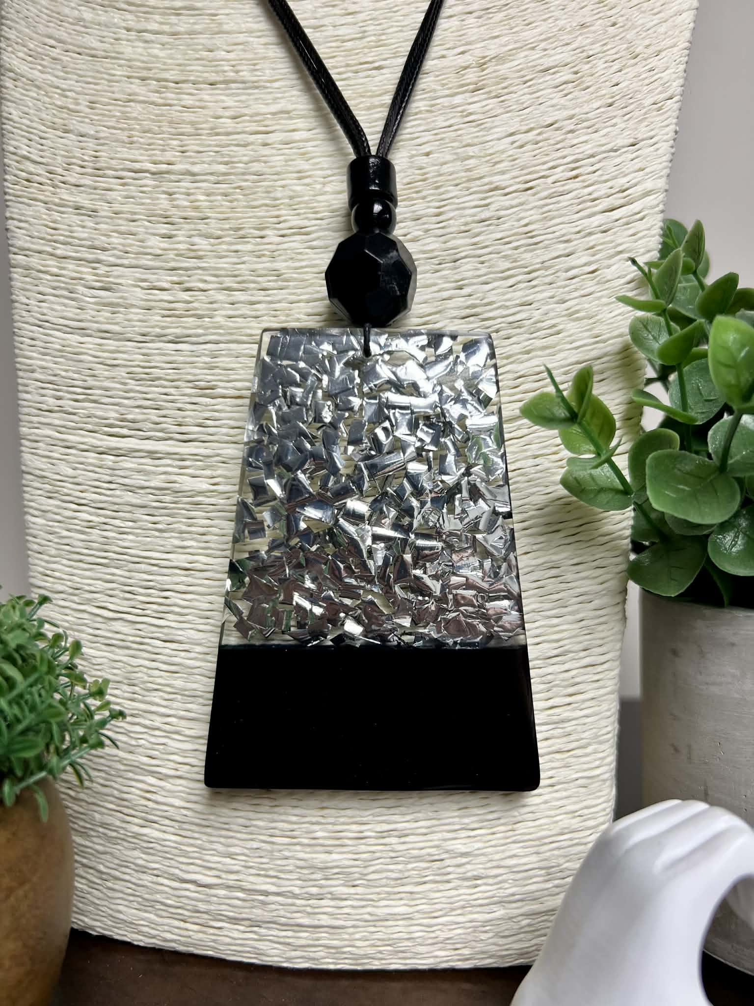 Adjustable String Necklace with Silver Resin Foil Pendant