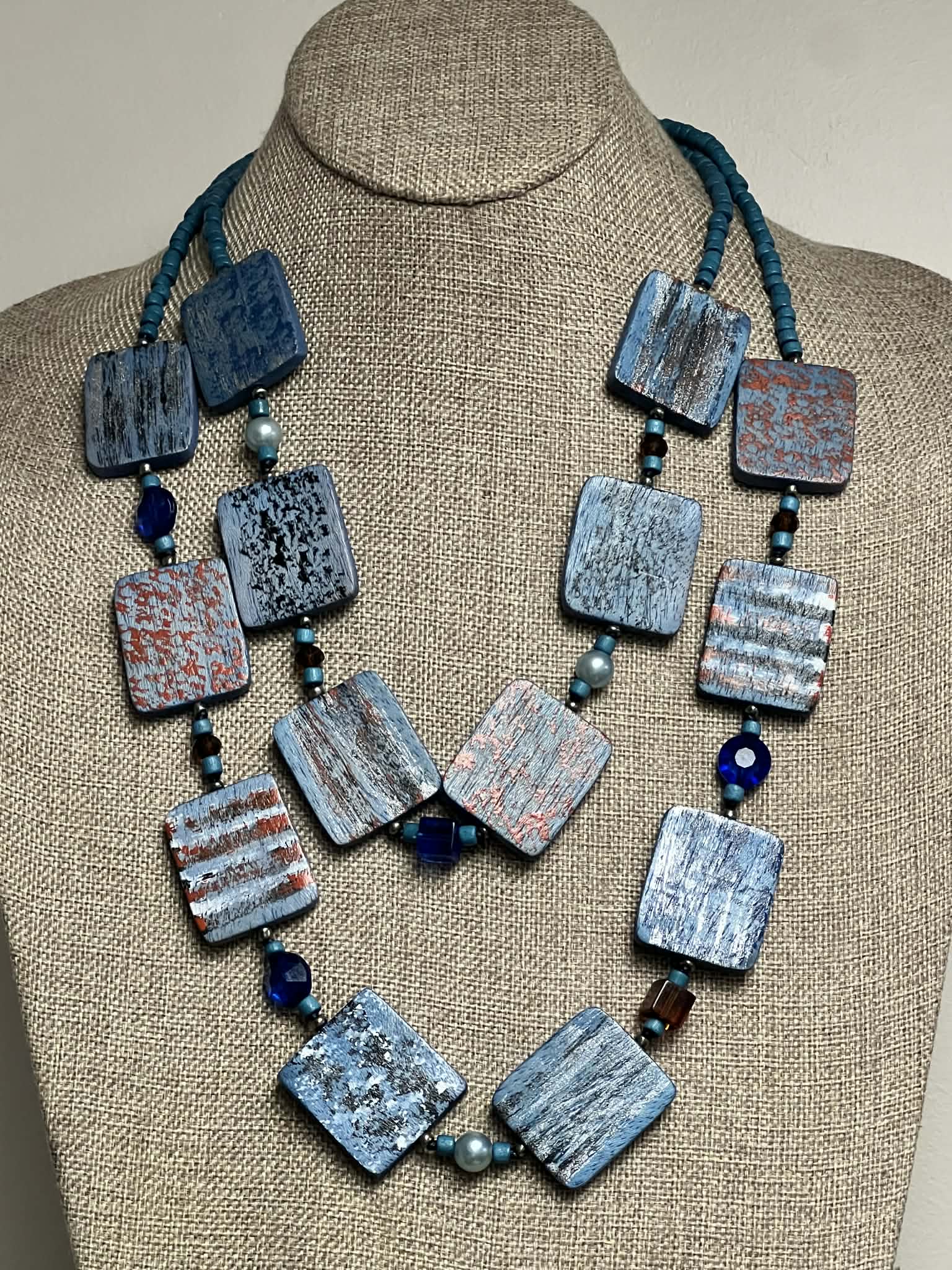 - Blue Wooden Beads with multi-coloured wooden square accents