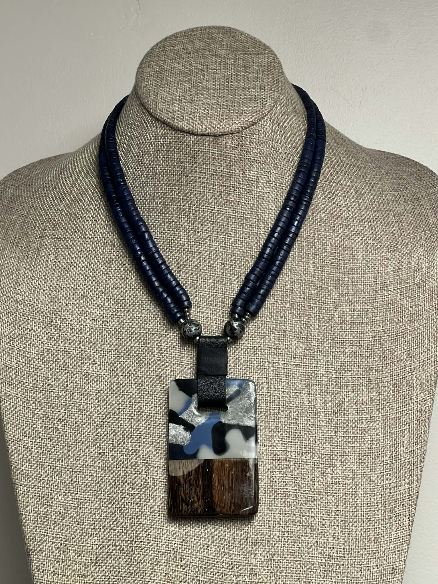 - Leather Strap with Square Wood and Marble Pendant