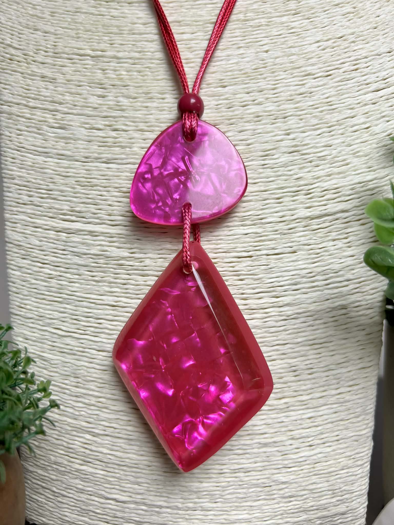 Unleash your inner gem with this fabulous pink necklace showcasing a chunky marble diamond-shaped pendant. The striking geometric design paired with beautiful marble patterns creates a statement piece that's equal parts sophisticated and fun. Perfect for adding a splash of color and personality to your look, this necklace proves that bold accessories are always in style!