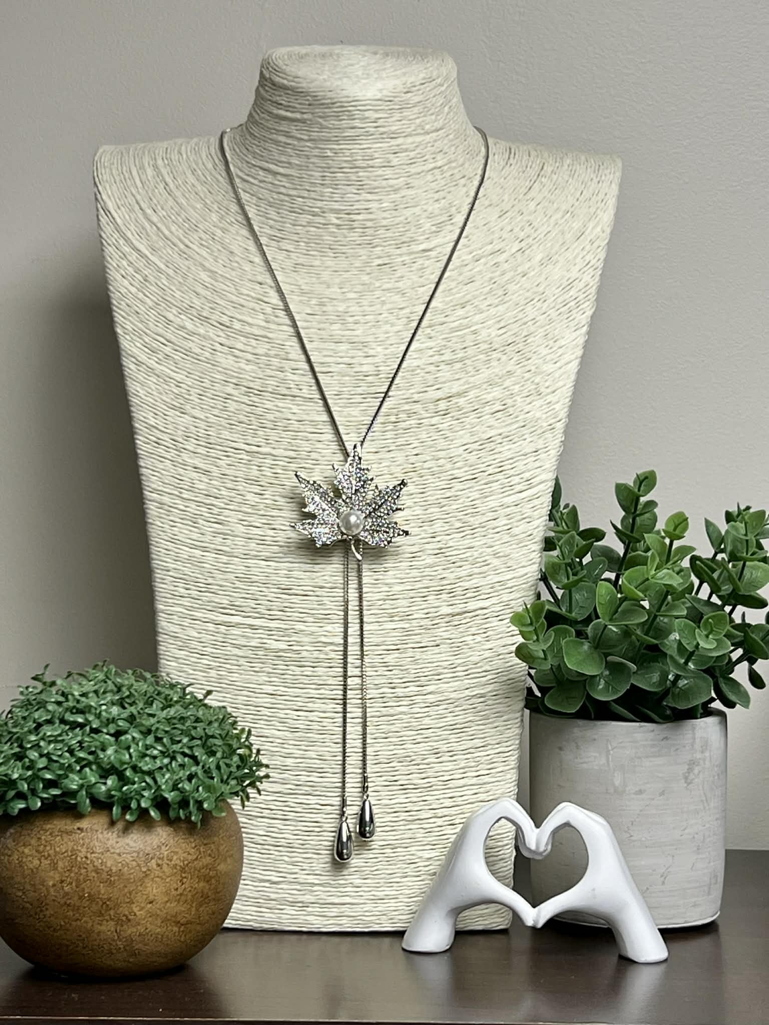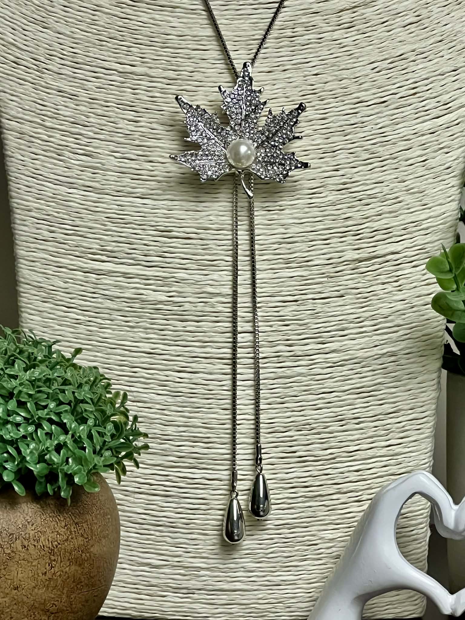 Celebrate Canadian pride with this stunning rhinestone maple leaf necklace adorned with a lustrous pearl. The iconic leaf design sparkles with rhinestone brilliance while the elegant pearl adds timeless sophistication. Perfect for showing your patriotic spirit or simply loving the beauty of nature, this charming piece combines national pride with playful glamour!