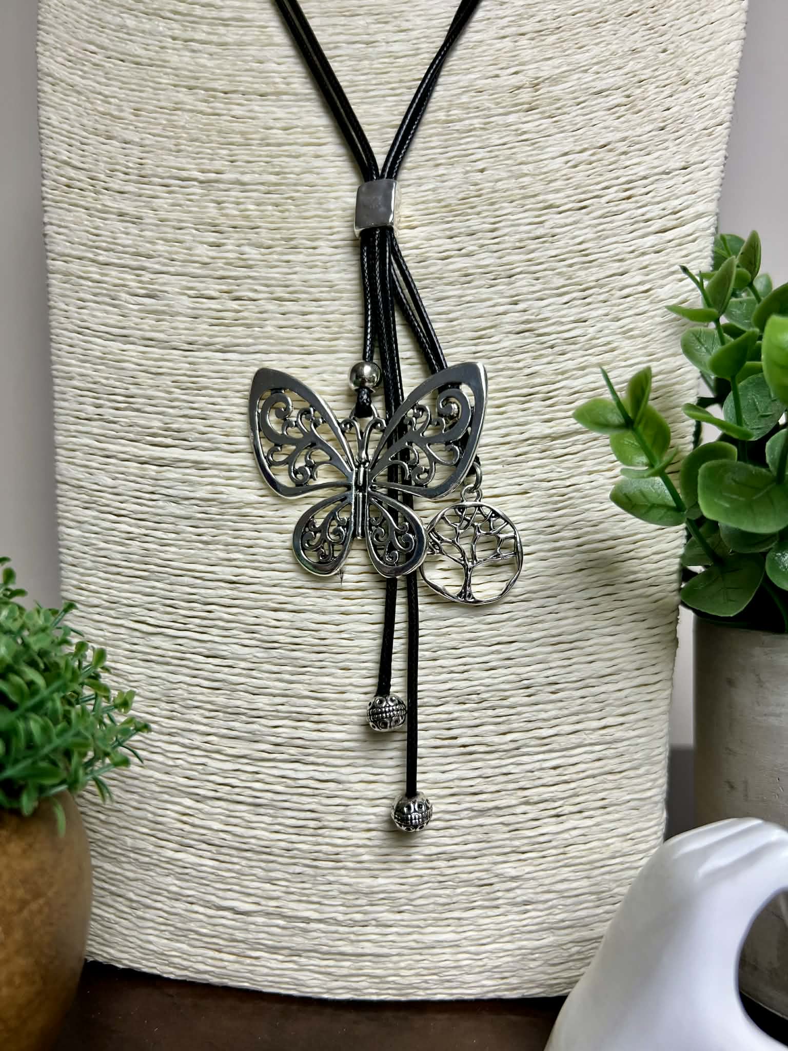 Embrace nature's magic with this enchanting silver butterfly necklace featuring a hanging Tree of Life pendant. The delicate butterfly pairs beautifully with the symbolic tree design, creating a meaningful piece that celebrates growth and transformation. Long and adjustable for the perfect fit, this whimsical necklace brings a touch of natural wonder to your everyday style!