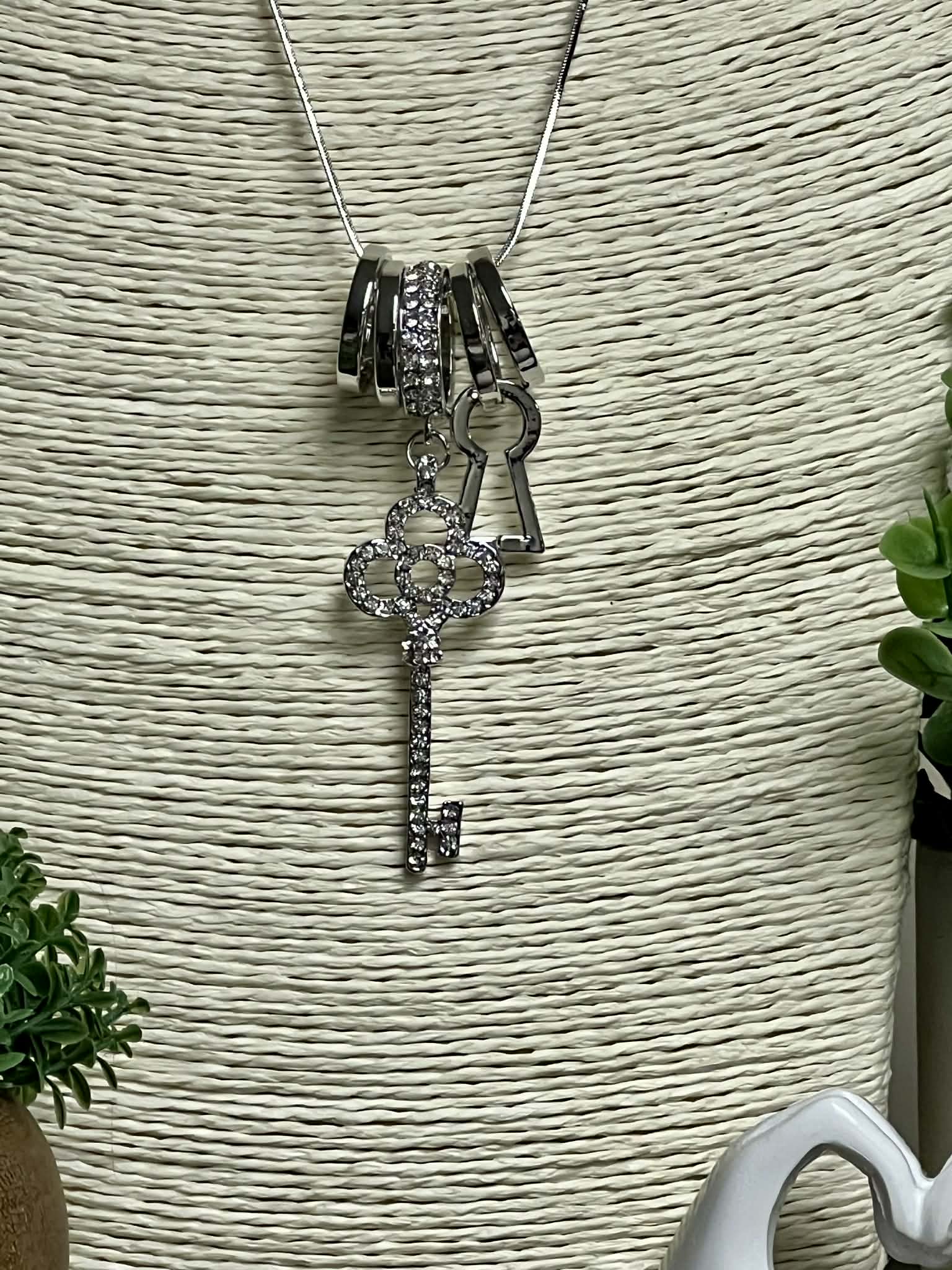 Wear your heart on your sleeve with this romantic silver rhinestone "Key to My Heart" necklace. The sparkling key design combines sentiment with sparkle, making it the perfect way to express affection or celebrate self-love. With glittering rhinestone details that catch the light beautifully, this charming piece proves that the way to anyone's heart starts with a little shimmer and style!
