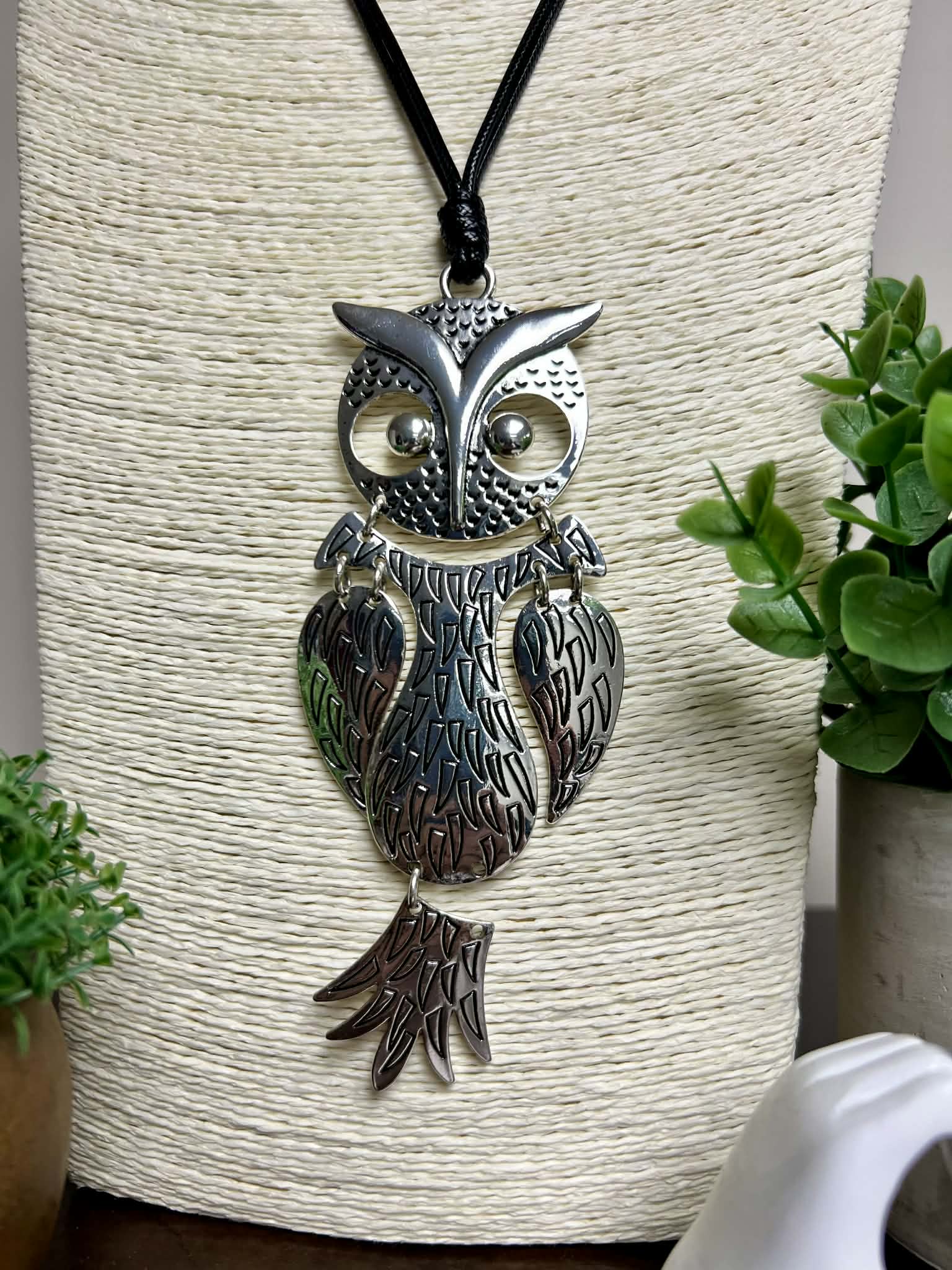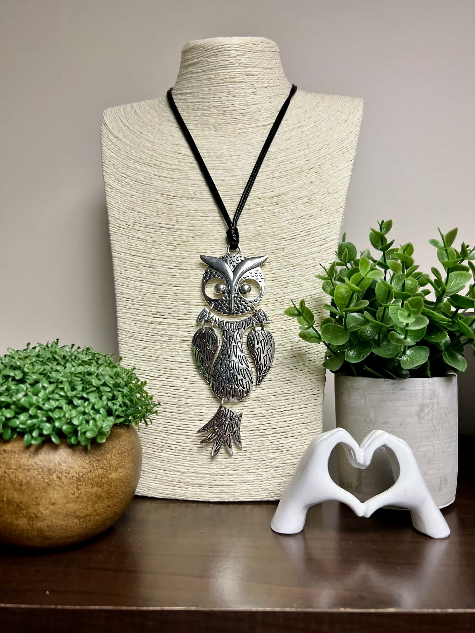 Silver Textured Owl Necklace Adjustable String