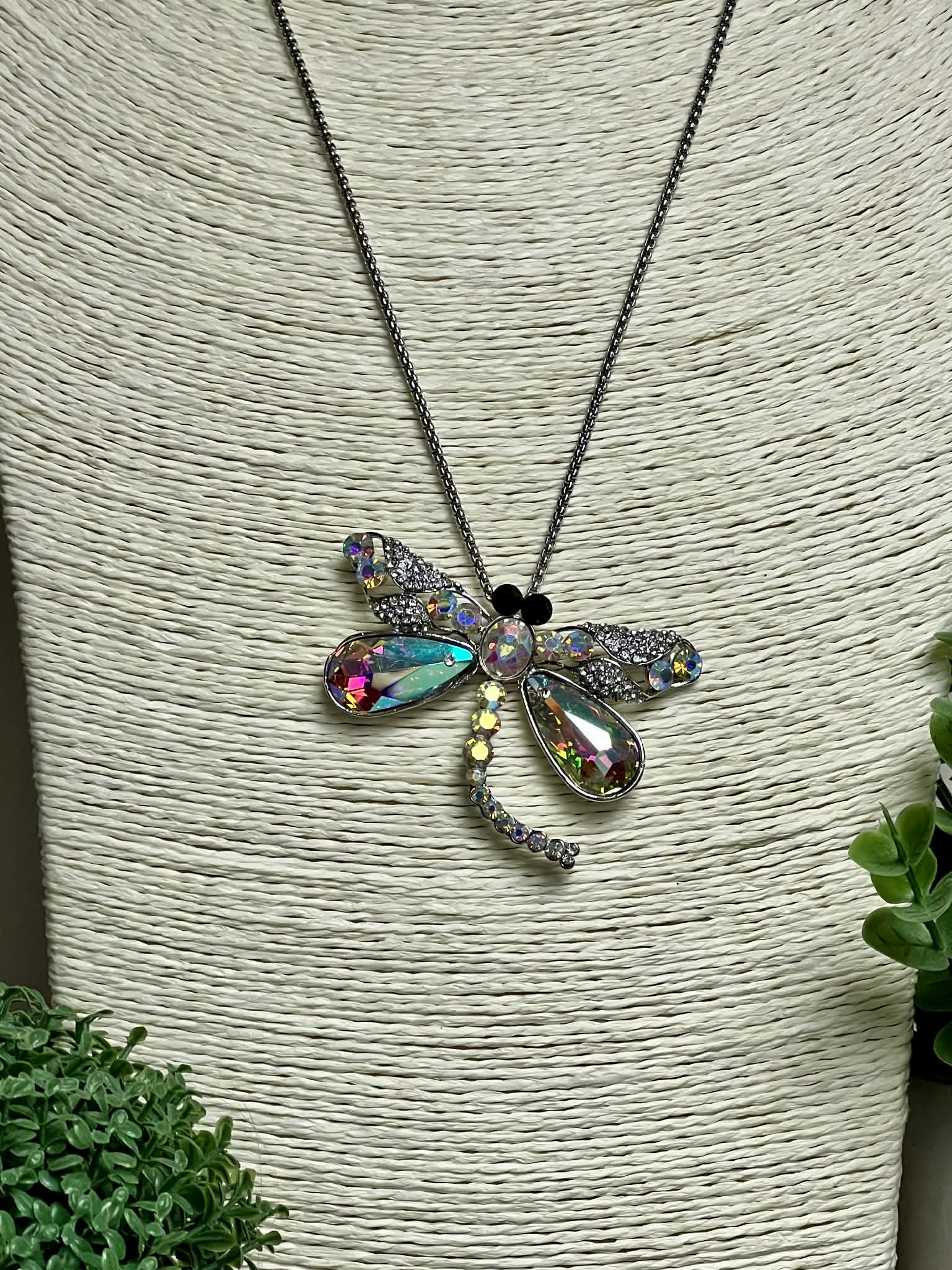 Add a touch of whimsy to your look with this silver necklace featuring a charming dragonfly pendant adorned with colorful rhinestone accents. Perfect for brightening any outfit with a playful sparkle and a hint of nature-inspired magic.