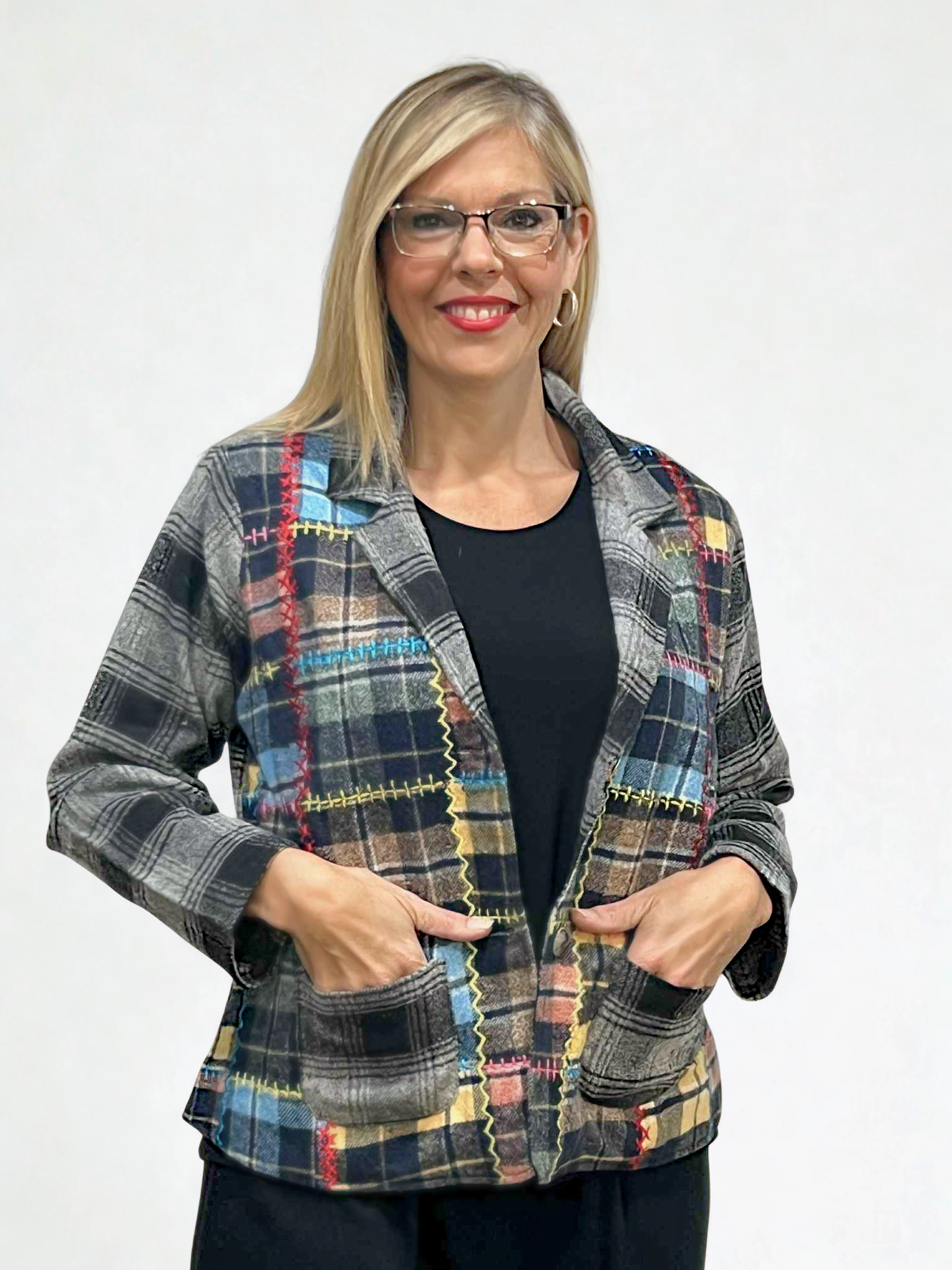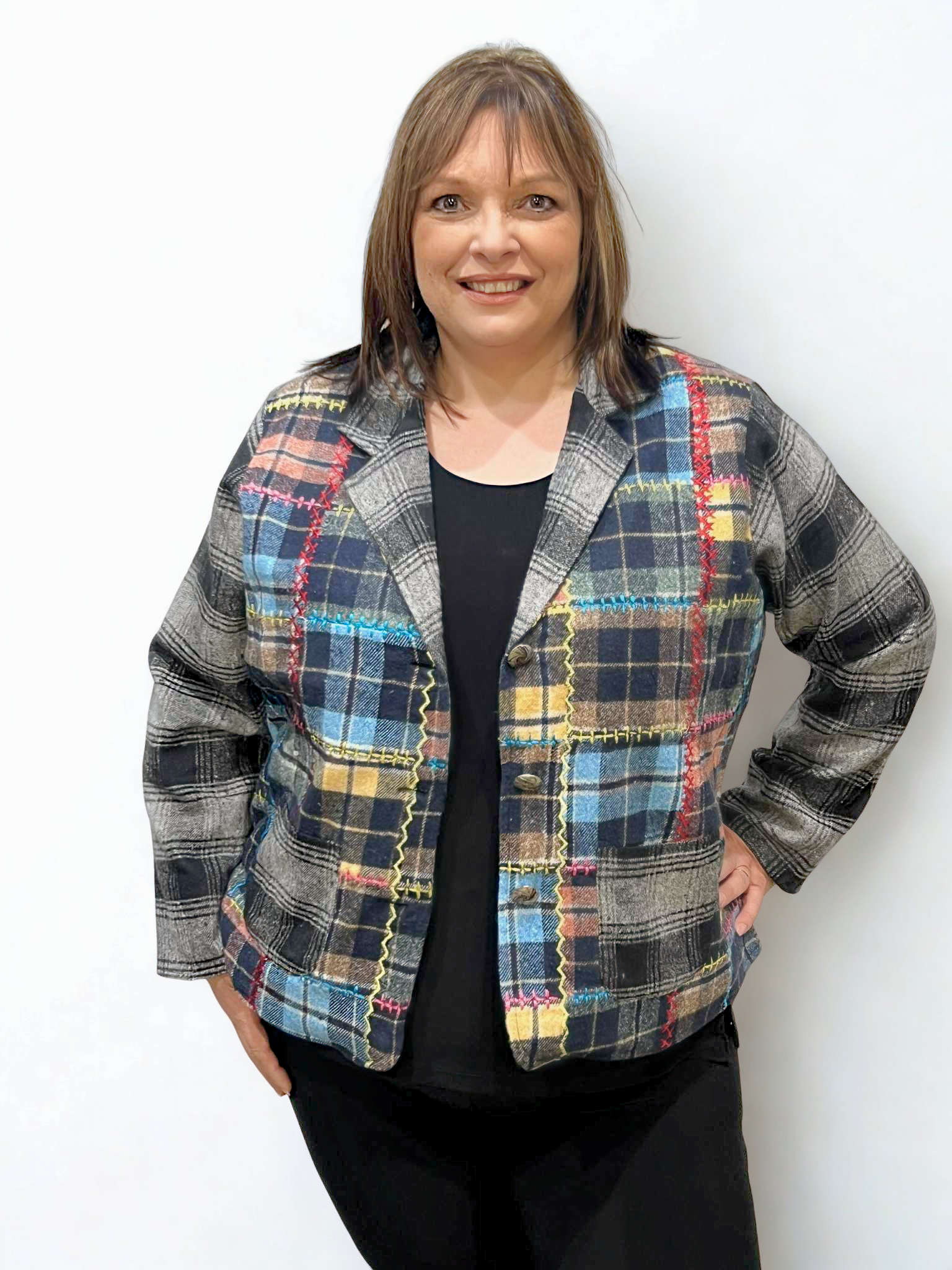 Turn heads with the Parsley & Sage Plaid Vinni Patchwork Jacket! Featuring vibrant accent stitching, a stylish V-neck collar, and a button-up front, this playful jacket adds a fun twist to classic plaid. With handy pockets for all your essentials, it’s the perfect way to layer up and show off your colorful personality.