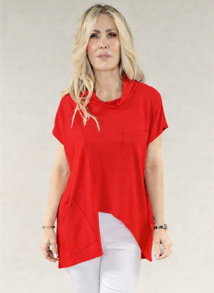 Make a bold statement with this striking red tunic from Michael Tyler. The front cut-out detail adds an edgy, contemporary edge while the asymmetric cut creates a flattering, modern silhouette. Two functional front pockets offer practical style, and the lightweight fabric ensures all-day comfort. Perfect for those who want to stand out with trendy, fashion-forward pieces that don't compromise on wearability.