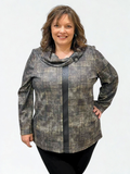 Add a splash of fun with the Modes Crystal Vibrant Multi-Coloured Cowl Neck Waffle Tunic. This playful top features a cozy waffle texture, leather strap and button on the neckline, and sleek leather cuffs. Leather detailing runs down the front, while the lively pattern continues all the way to the back for a lively, eye-catching look.