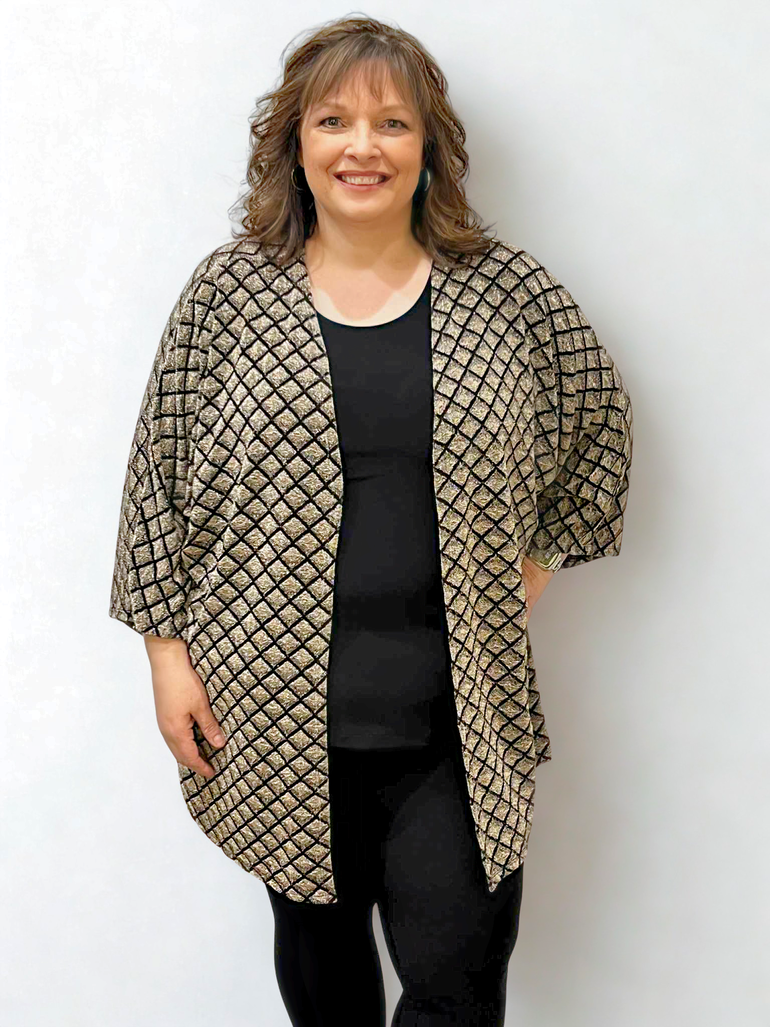 Step into holiday sparkle with the Modes Crystal Shimmering Champagne Fashion Jacket! Lightweight and easy to wear, it features a chic diamond pattern and playful 3/4 sleeves that add just the right amount of flair. Perfect for layering over your festive looks, this jacket brings shimmer and shine to every celebration. Dance, dazzle.