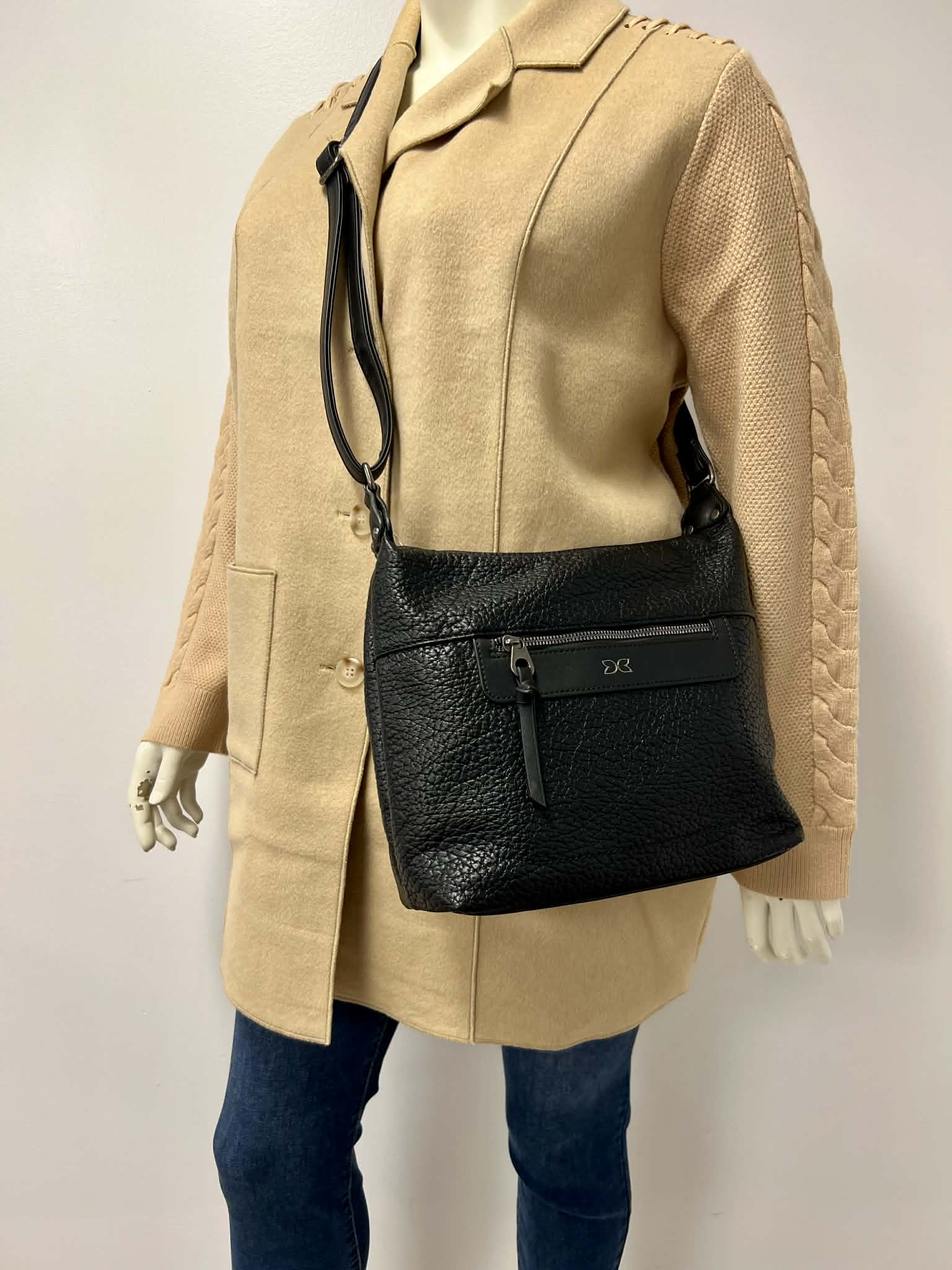 Black Vegan Leather Shoulder Bag, Front Zip