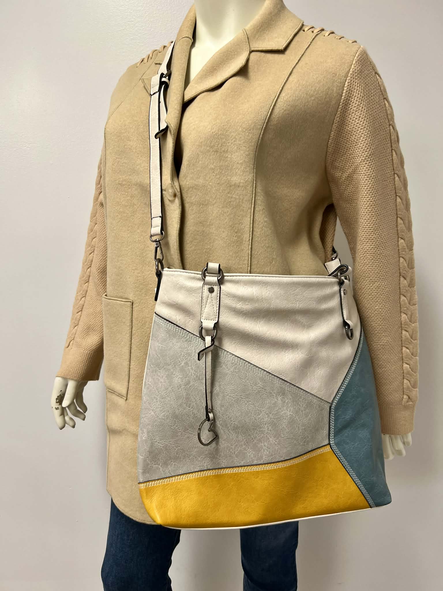 Cream Purse with Tri-Colour Patchwork, blue, yellow, grey