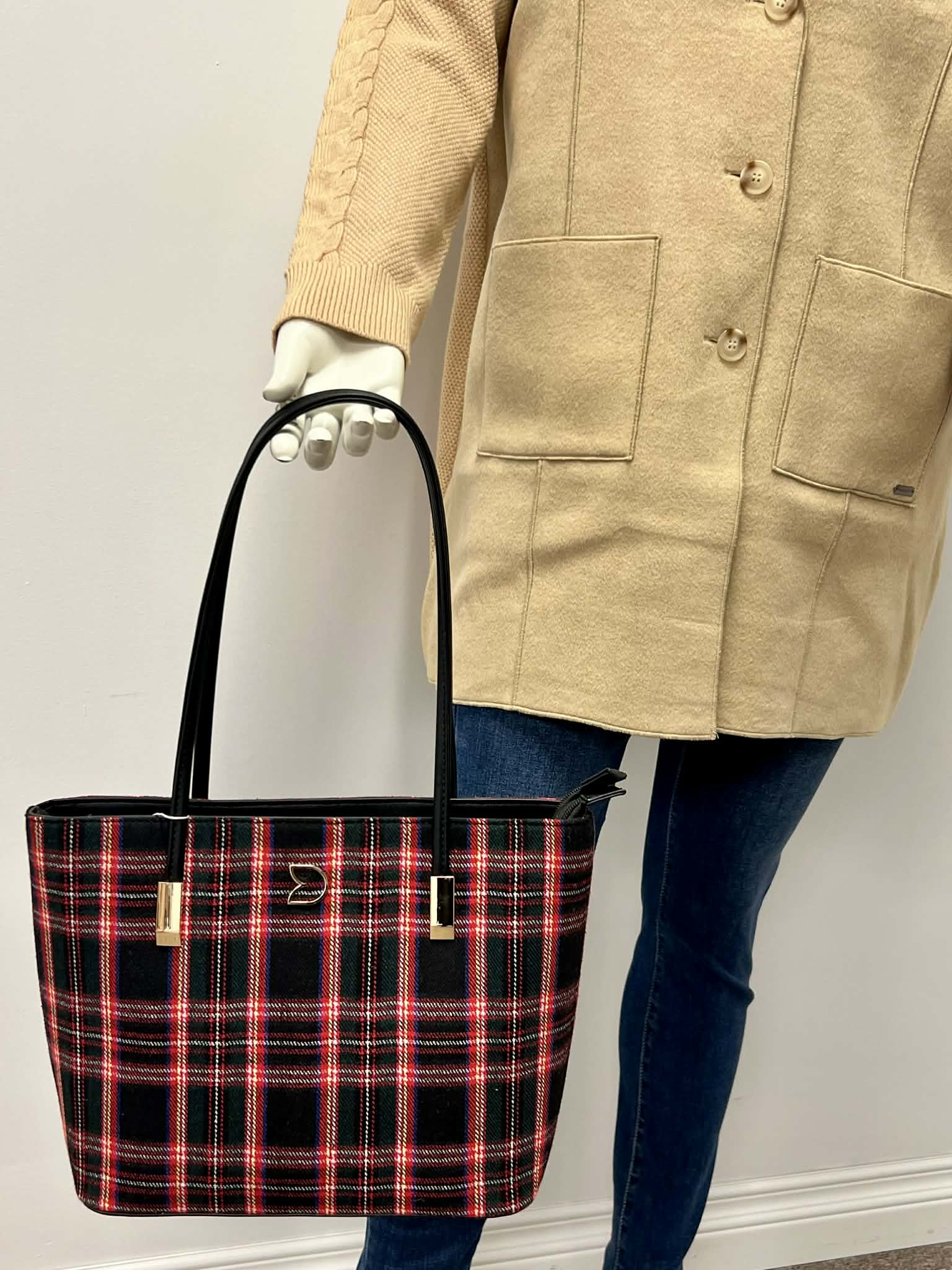 Red Plaid Handbag, Double Zip Closure