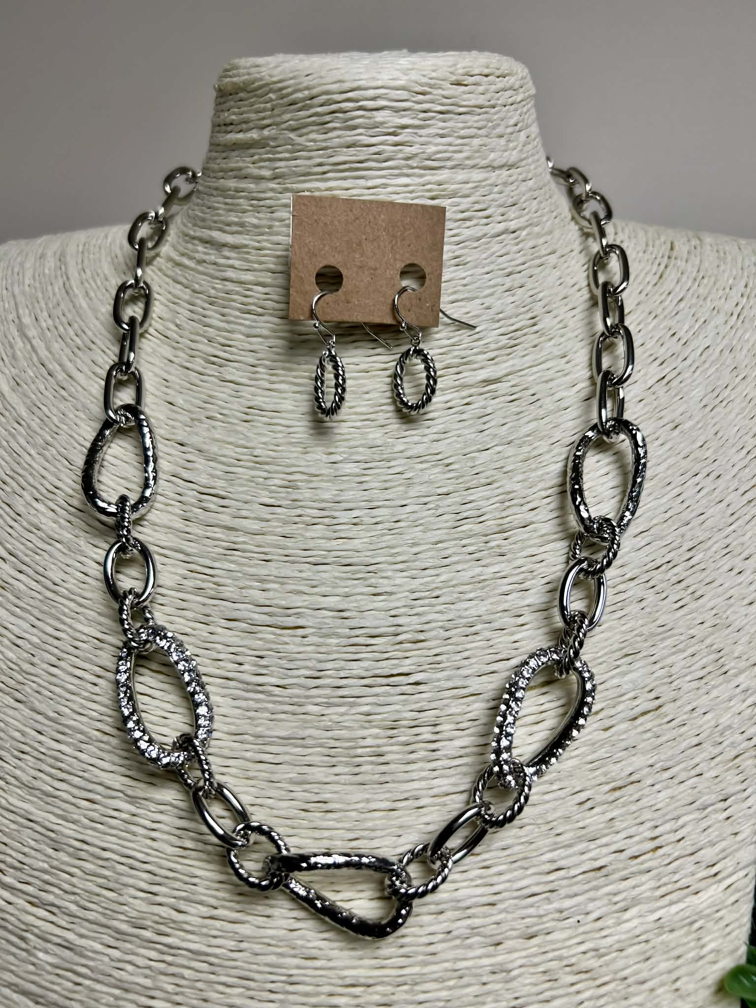 Sparkle and shine with this dazzling silver rhinestone chain link necklace paired with matching earrings. The glittering rhinestones catch the light beautifully, creating an eye-catching accessory set perfect for adding glamour to any outfit. Whether you're dressing up for a special occasion or elevating your everyday look, this coordinated duo delivers instant elegance and fun.