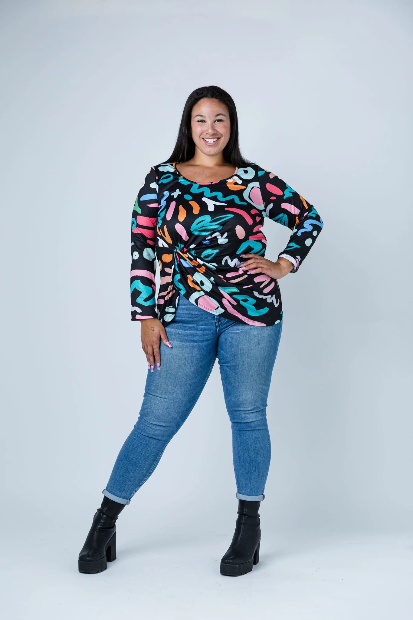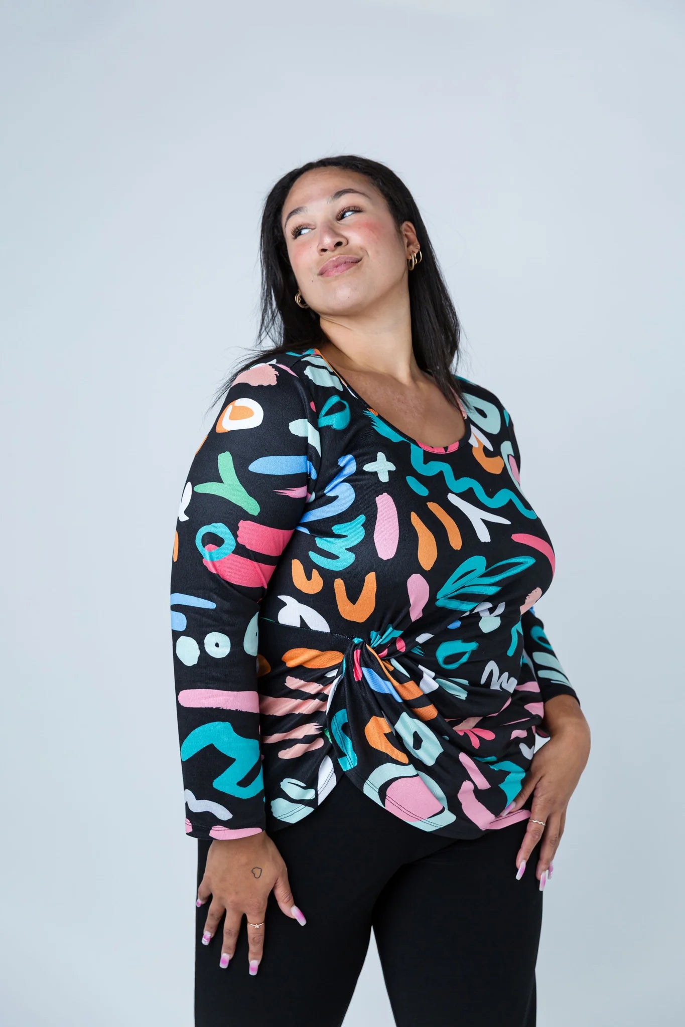 Look effortlessly cool and stylish in our Black LABB 80's Side Knotted Top! Made of soft and lightweight poly spandex, this top features a funky print and a flattering knotted design that looks great on all body types. Perfect for a fun and playful look, this top will surely turn heads wherever you go!