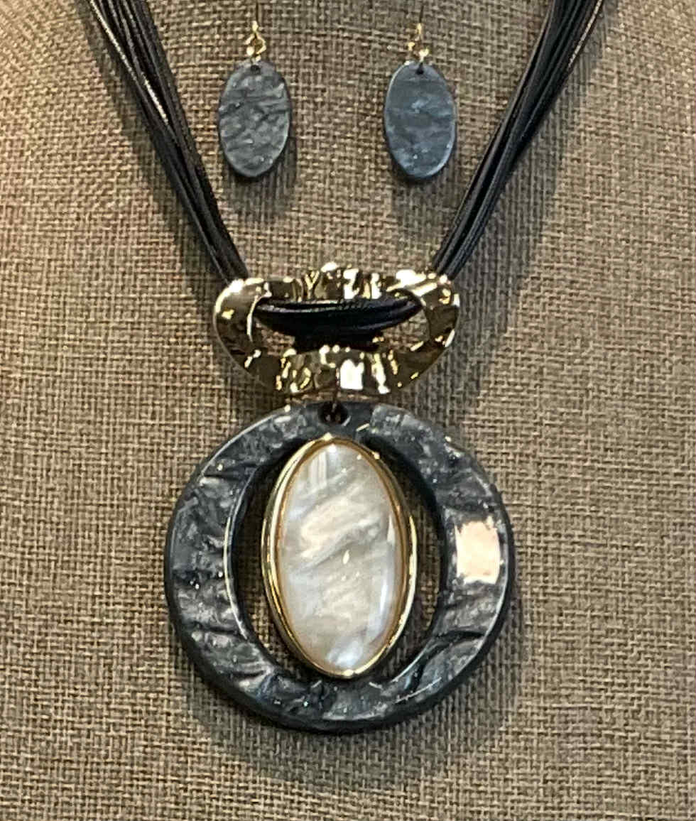 Brighten your look with this playful necklace set featuring a grey and cream marble circle pendant paired with matching oval resin earrings. The unique swirls and shapes add a fun, coordinated touch that's perfect for mixing and matching with your favorite outfits.