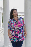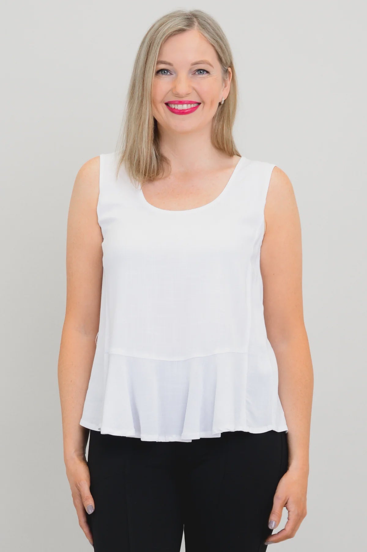 A deep, U-neckline and wide shoulder straps make a simple canvas for accessories. The Ginny has a boxy, loose fit down the body, ending with a slight peplum hem at the hips. Thanks to it's flowy but slim shape, the Ginny is versatile enough to be paired with your choice of flared or fitted bottoms.
