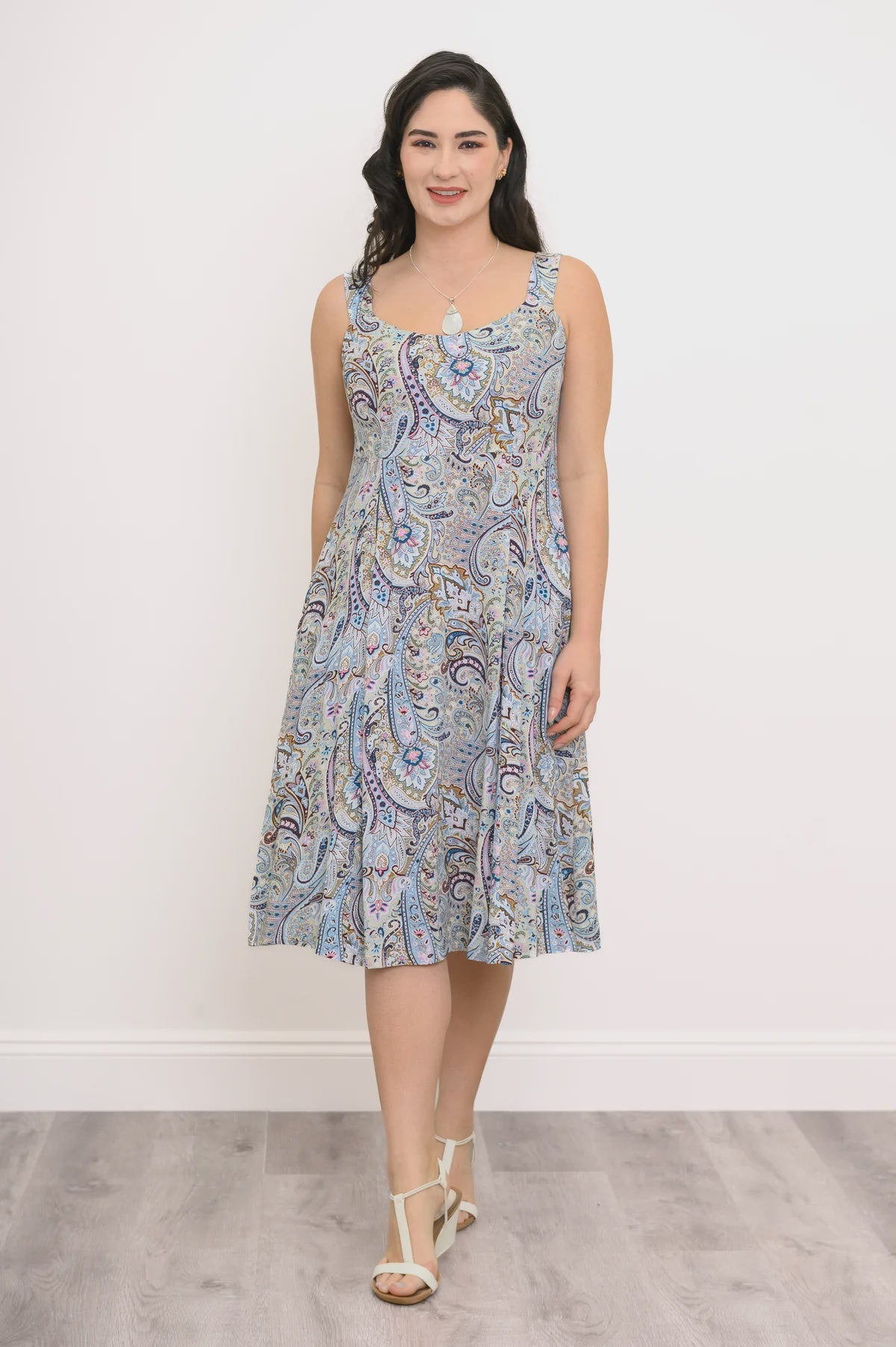 The Shauna is a true Blue Sky favourite. It features an empire waist, A-line skirt and pockets. The back of the bodice is shirred for a perfect fit and enhances all figures. The straps are ample for concealing your bra, so wear it alone or pair it with a shrug for more coverage.
