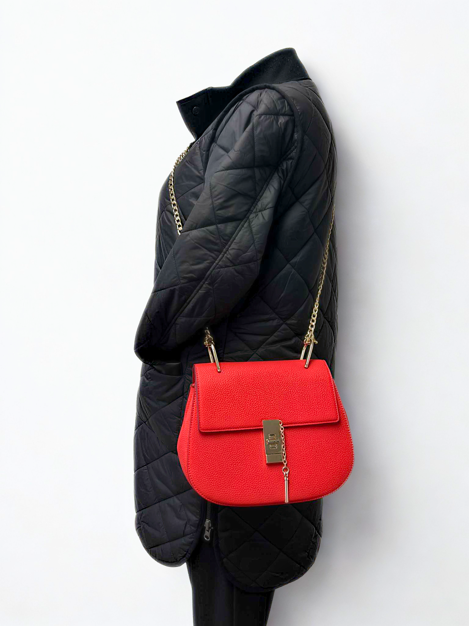 Make a bold statement with this vibrant red purse, complete with a chic gold chain strap and accents. Its inside zipper closure keeps your items secure, while the outside buckle adds a stylish touch. Perfect for adding a pop of color and playful elegance to any outfit!