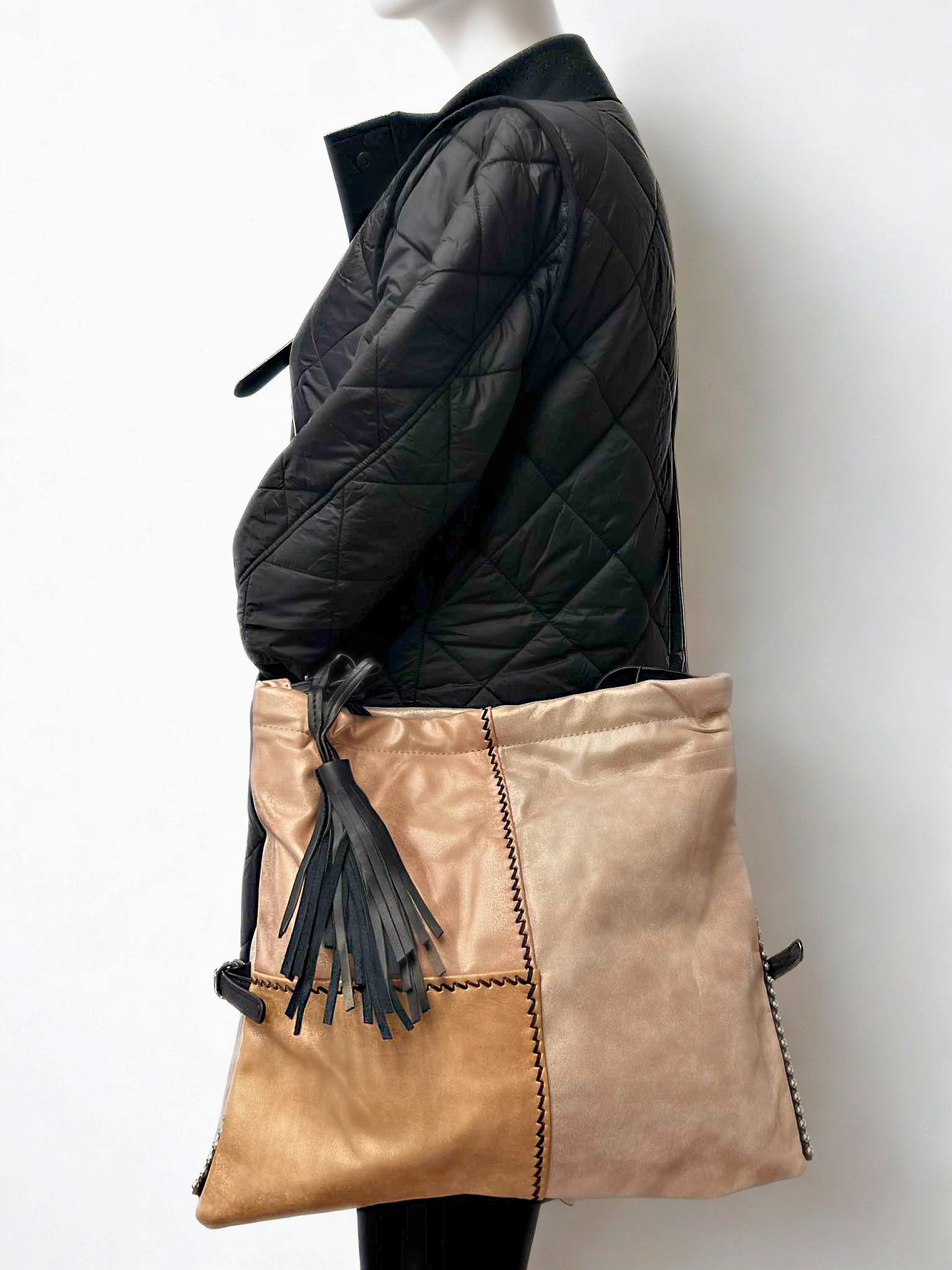 Add a splash of fun with this color-blocking purse in pink hues, highlighted by bold black stitching and straps. Buckle and studding details combined with a tassel charm give it a playful edge. Featuring both a short double strap and a long strap, plus a secure zipper closure, it’s the perfect mix of style and versatility for any outing!
