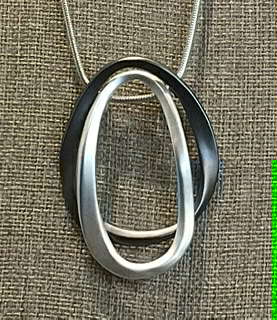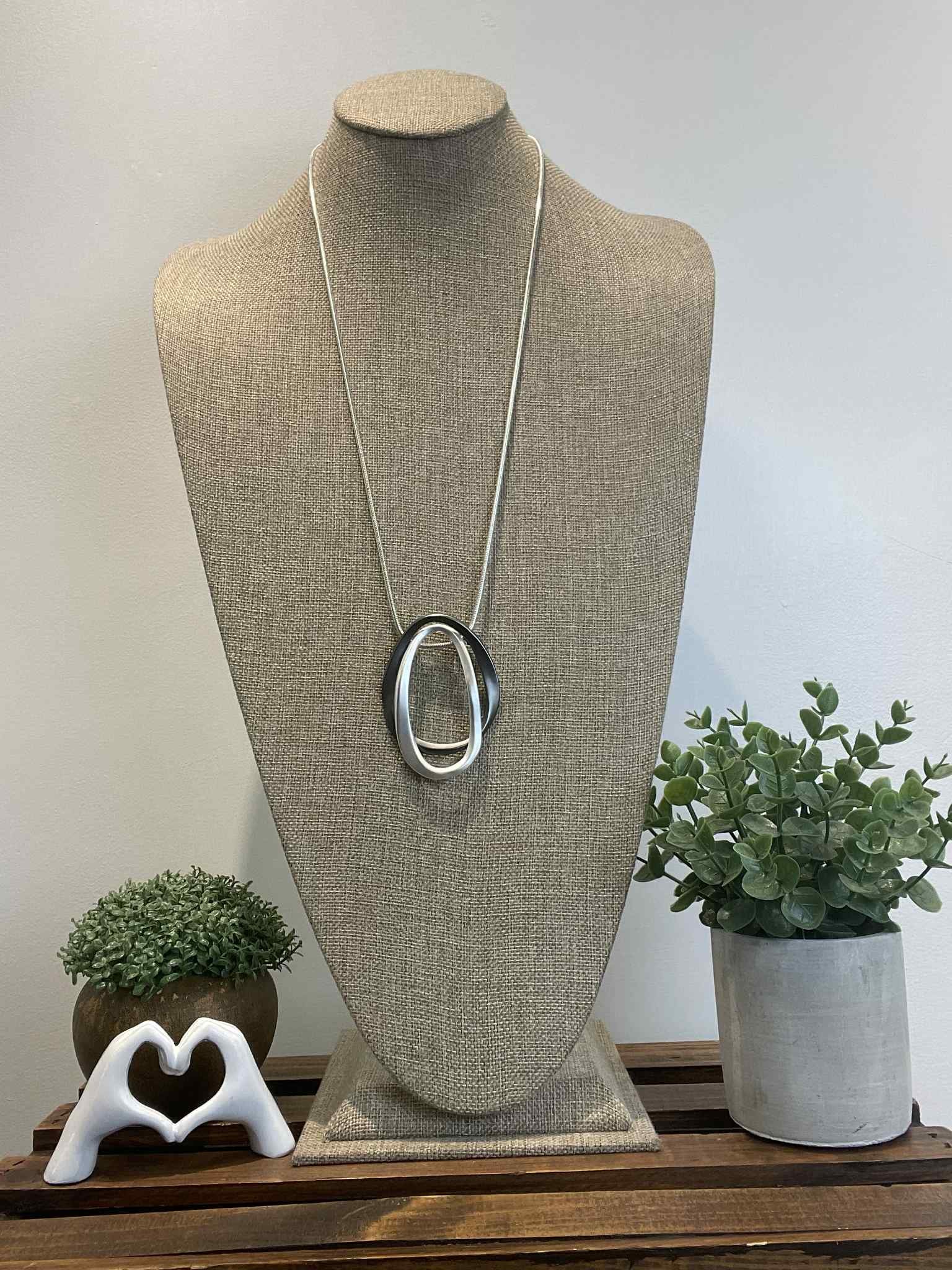 An abstract take on balance and form, with two polished circles as a necklace! Complete with a silver lobster clasp closure.