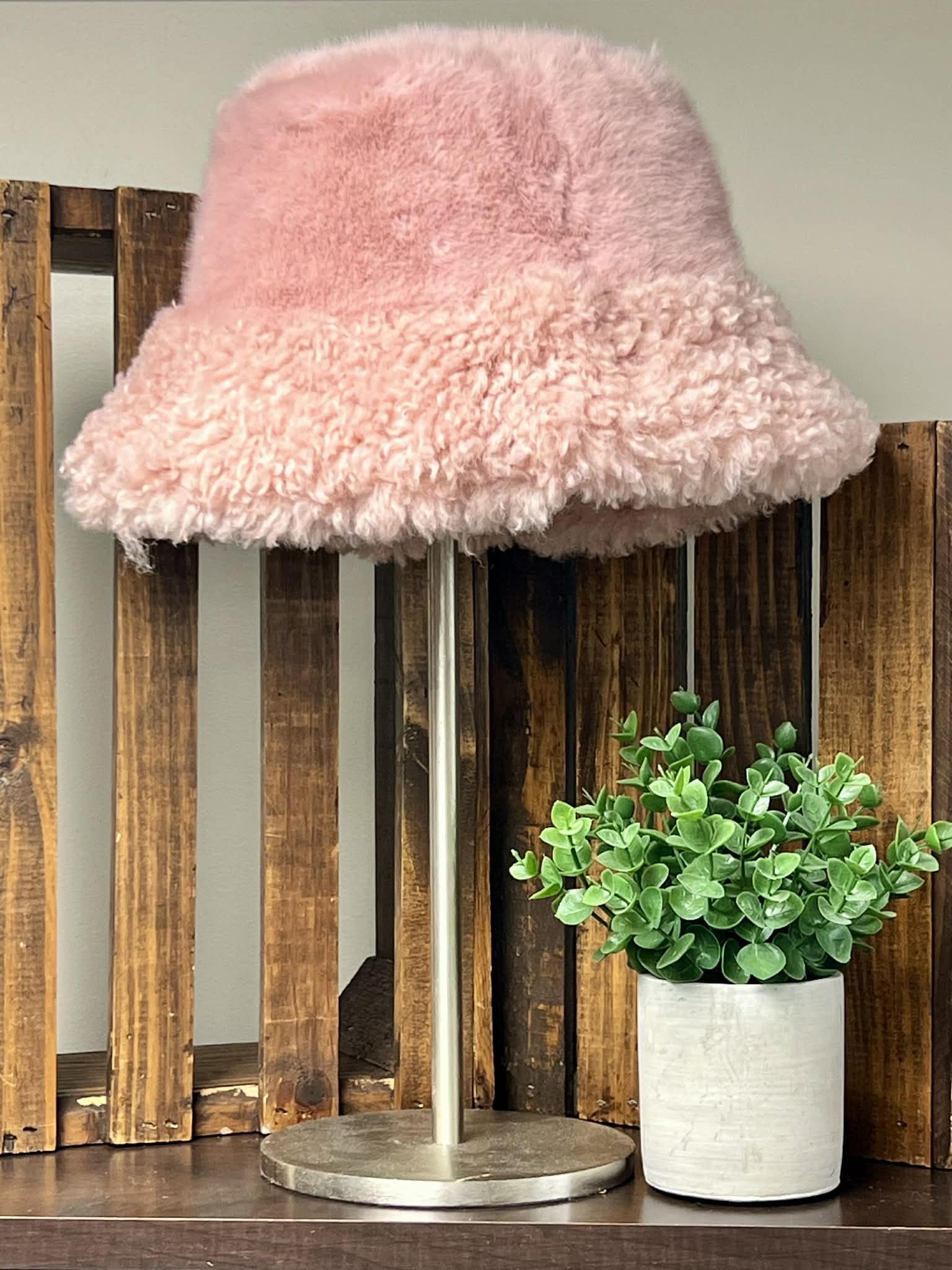 Pink Faux Fur Bucket Hat with Sherpa Brim